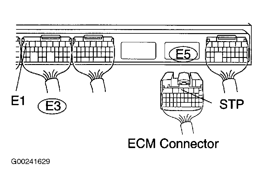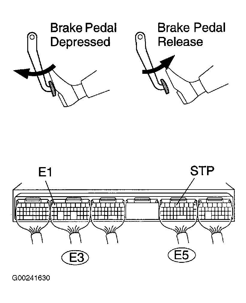 - Turn the ignition switch ON. Measure voltage between terminal E1 of ECM E3 connector and terminal STP of ECM E5 connector. See Figure. With brake pedal depressed, 7.5-14 volts should be present. With brake pedal released, less than 1.5 volts should be present. If okay, check for intermittent problems. If not okay, go to next step.