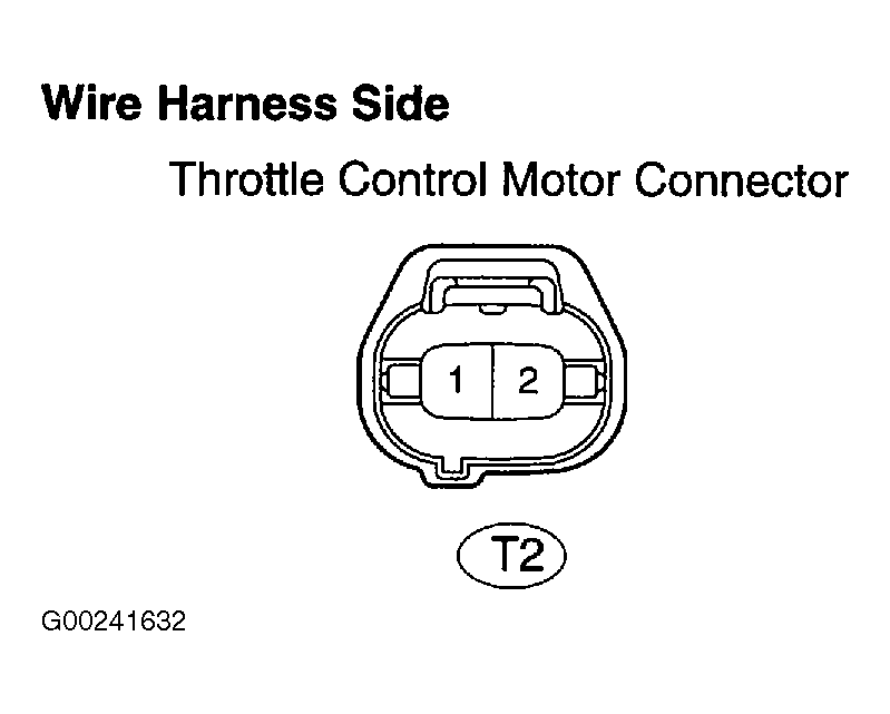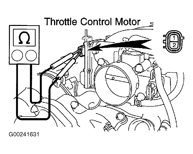 - Disconnect the throttle control motor connector. Measure the resistance between the terminals of throttle control motor terminals No. 1 and 2. See Figure. Resistance should be .3-100 ohms at 68°F (20°C). If resistance is to specification, go to next step. If resistance is not to specification, replace throttle body assembly.