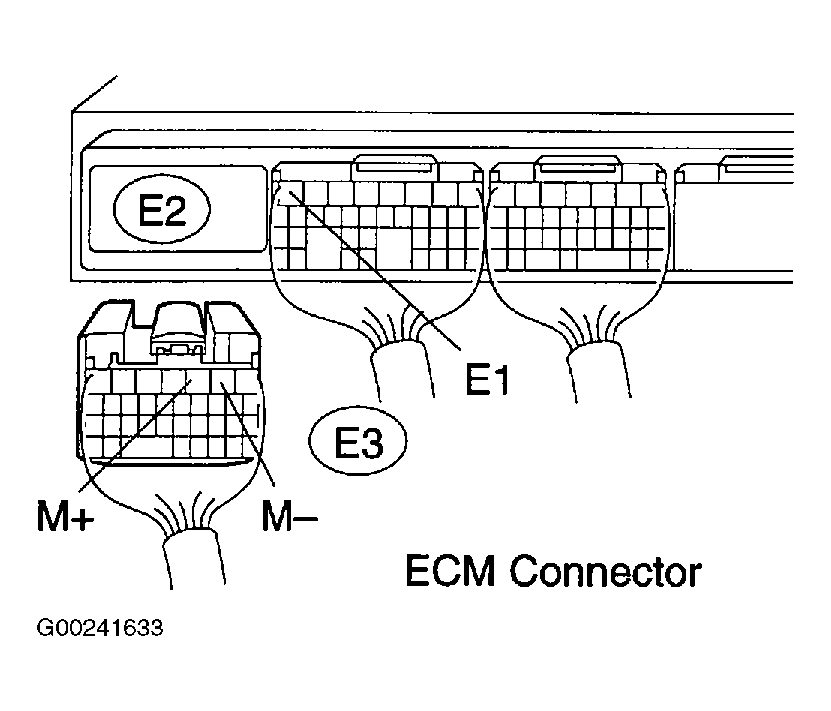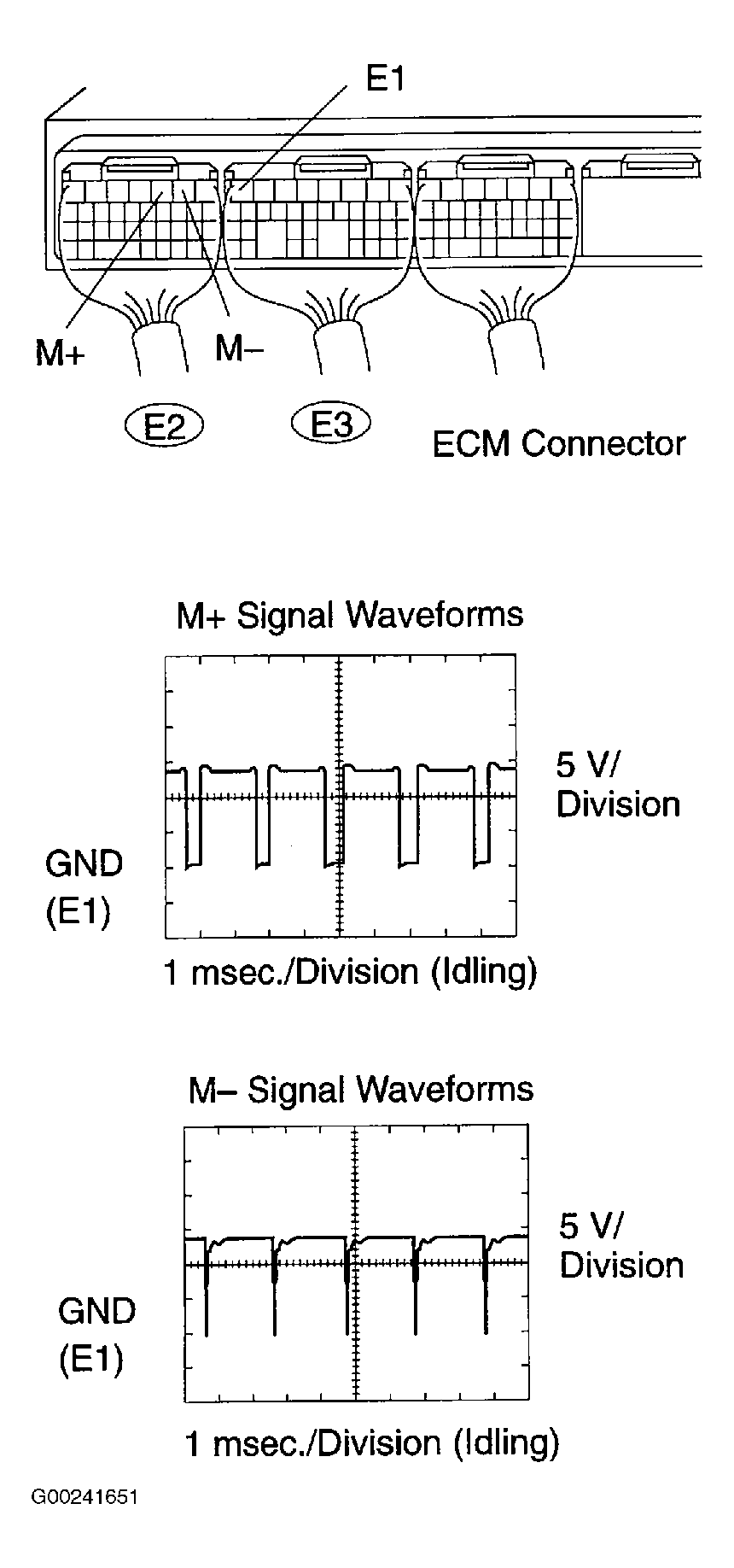 - Connect the oscilloscope between terminals M+ or M- of the ECM E2 connector and E1 of the ECM E3 connector. Start engine. During cranking or idling, check waveform between terminal M+ of ECM E2 connector and terminal E1 of ECM E3 connector, and between terminal M- of ECM E2 connector and terminal E1 of ECM E3 connector. See Fig 1. If waveforms are okay, go to next step. If waveforms are not okay, replace ECM.