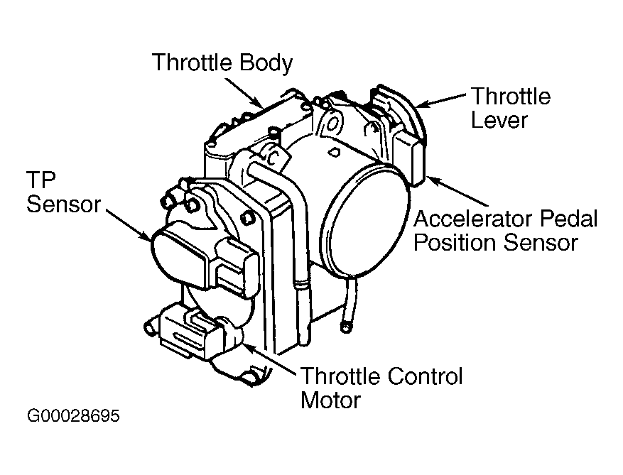 On all models, Electronic Throttle Control System (ETCS) consists of throttle body, accelerator pedal position sensor, Throttle Position (TP) sensor, throttle control motor, magnetic clutch and Engine Control Module (ECM). ETCS uses ECM to calculate throttle valve opening in the throttle body in relation to driving conditions. ETCS controls idle speed and cruise control system operation. Accelerator pedal position sensor is mounted on throttle body and is integrated with throttle lever which attaches to the throttle cable. See Fig 1 and Fig 2 . Accelerator pedal position sensor consists of 2 sensors which deliver input signals to the ECM. TP sensor delivers input signals to ECM to indicate throttle valve opening.