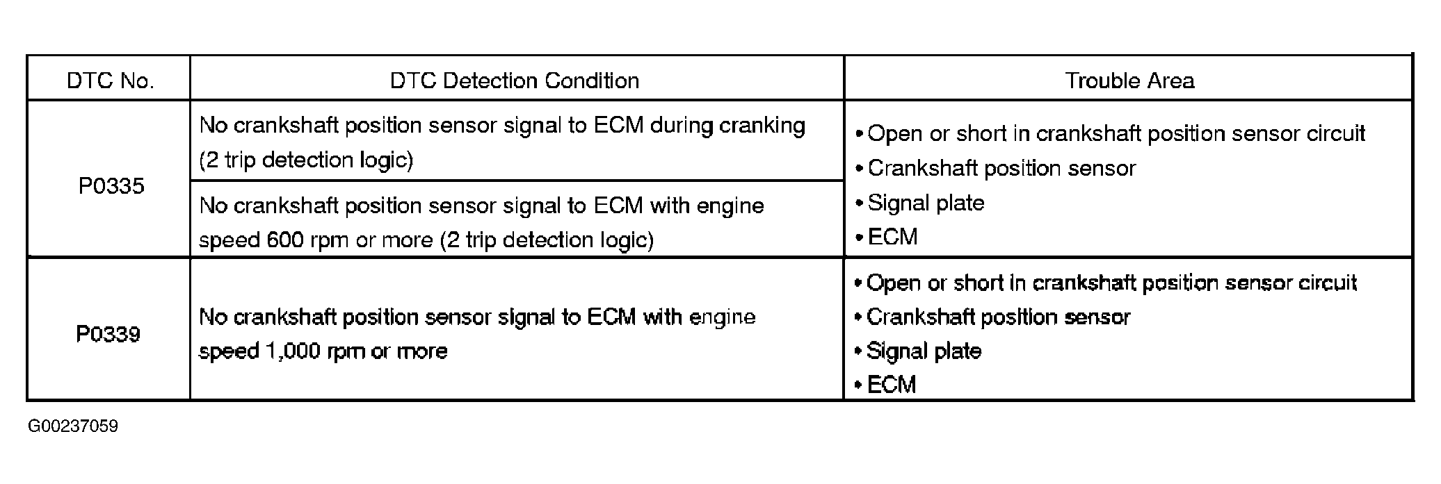 Home >> Toyota >> 2004 >> Matrix Base, FWD, Standard >> Repair and Diagnosis >> External Pages >> Different car >> Section 129 (Engine Control System Self Diagnostics) >> Diagnostic Tests >> DTC P0335: Crankshaft Position Sensor "A" Circuit Or DTC P0339: Crankshaft Position Sensor "A" Circuit Intermittent >> Possible Causes
