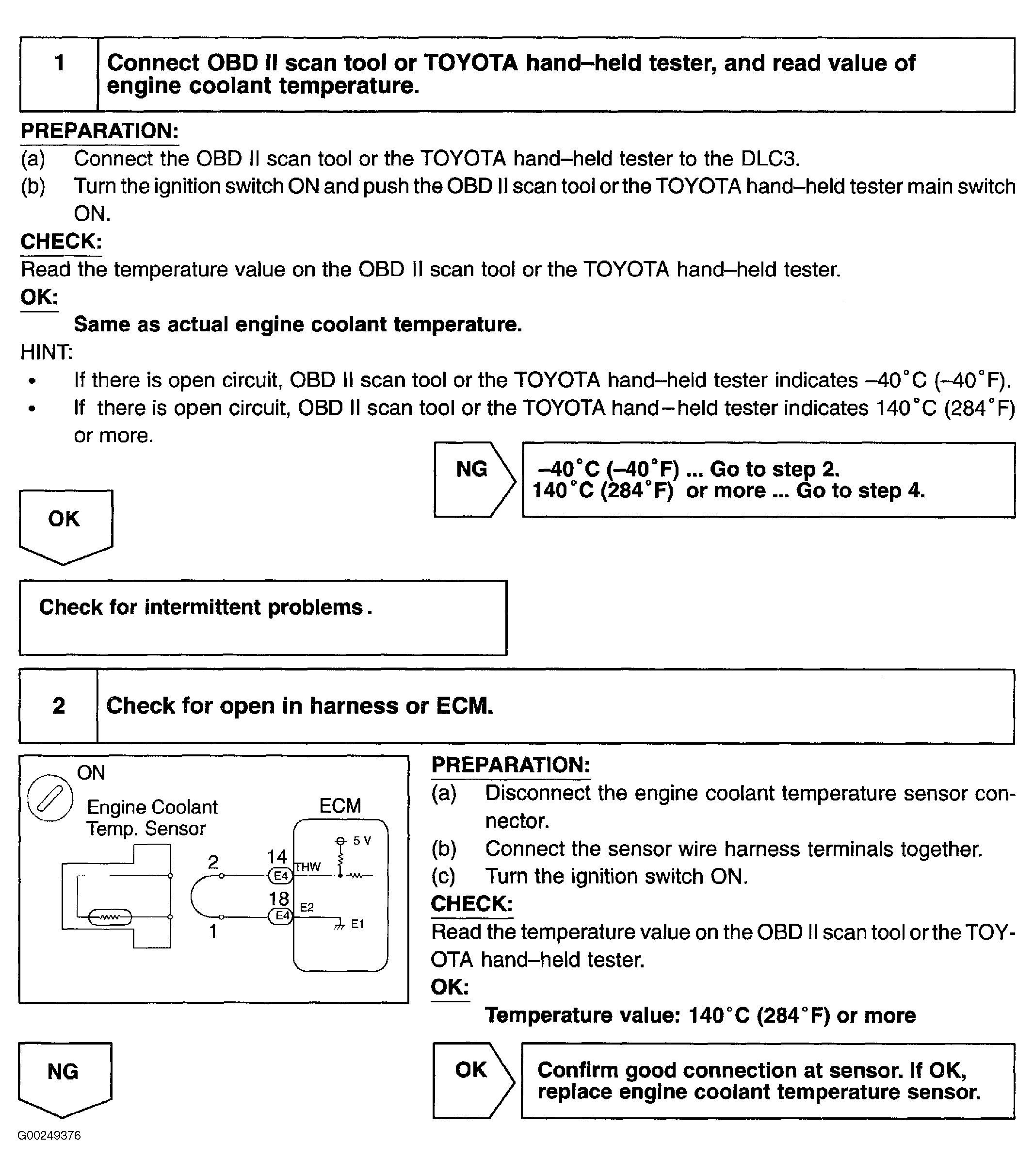 NOTE: After confirming DTC P0115, use Toyota hand-held tester or scan tool to access CURRENT DATA to confirm engine coolant temperature. If ECT sensor value displayed on hand-held tester or scan tool is always -40°F (-40°C), ECT sensor circuit may be open. If ECT sensor value displayed on hand-held tester or scan tool is always 284°F (140°C), ECT sensor circuit may be shorted. Using hand-held tester or scan tool, read FREEZE FRAME data. Freeze frame data records engine conditions when malfunction is detected.