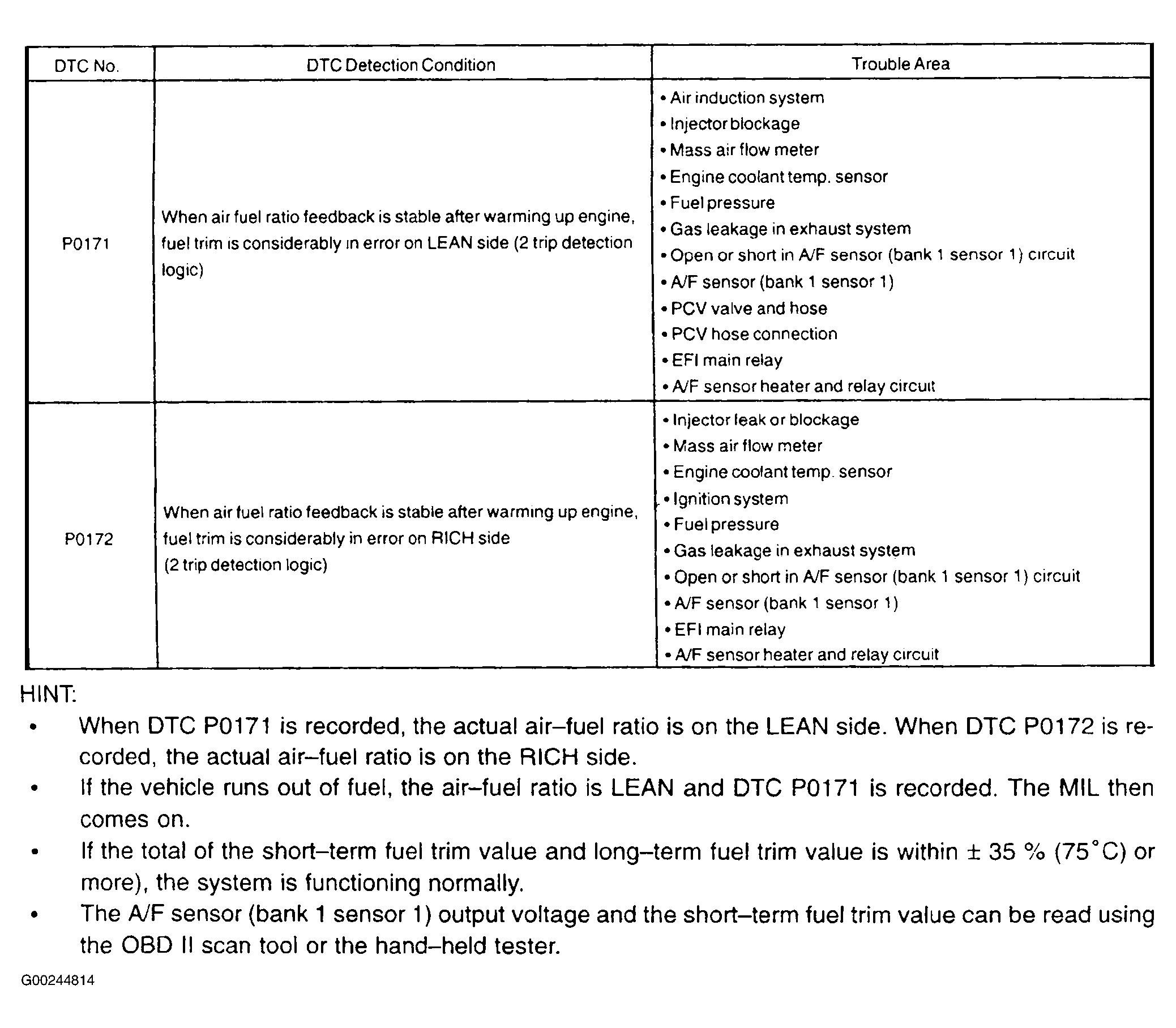 Fig 1: DTCs P0171 & P0172 Detecting Conditions & Possible Causes