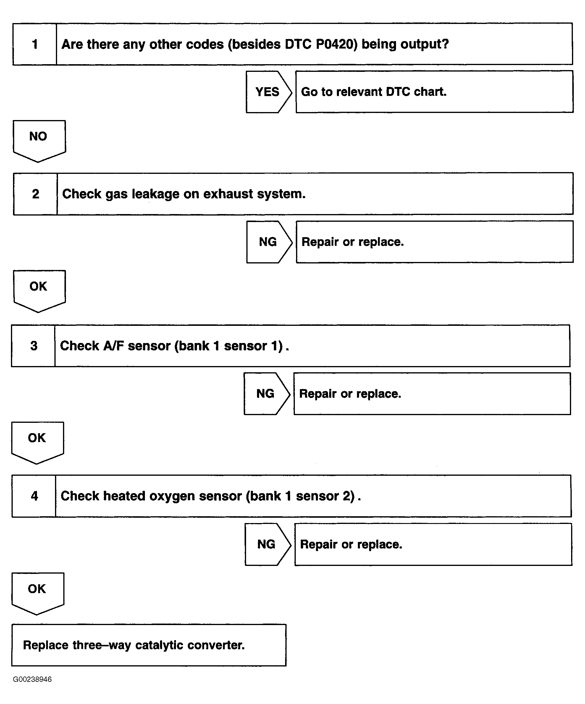 This DTC uses two-trip detection logic. Using Toyota hand-held tester or scan tool, read FREEZE FRAME data. Freeze frame data records engine conditions when malfunction is detected. To aid in diagnosis of deteriorated catalyst, it is recommended to perform Confirmation Engine Racing Pattern while observing HO2S waveform pattern. See CONFIRMATION ENGINE RACING PATTERN .