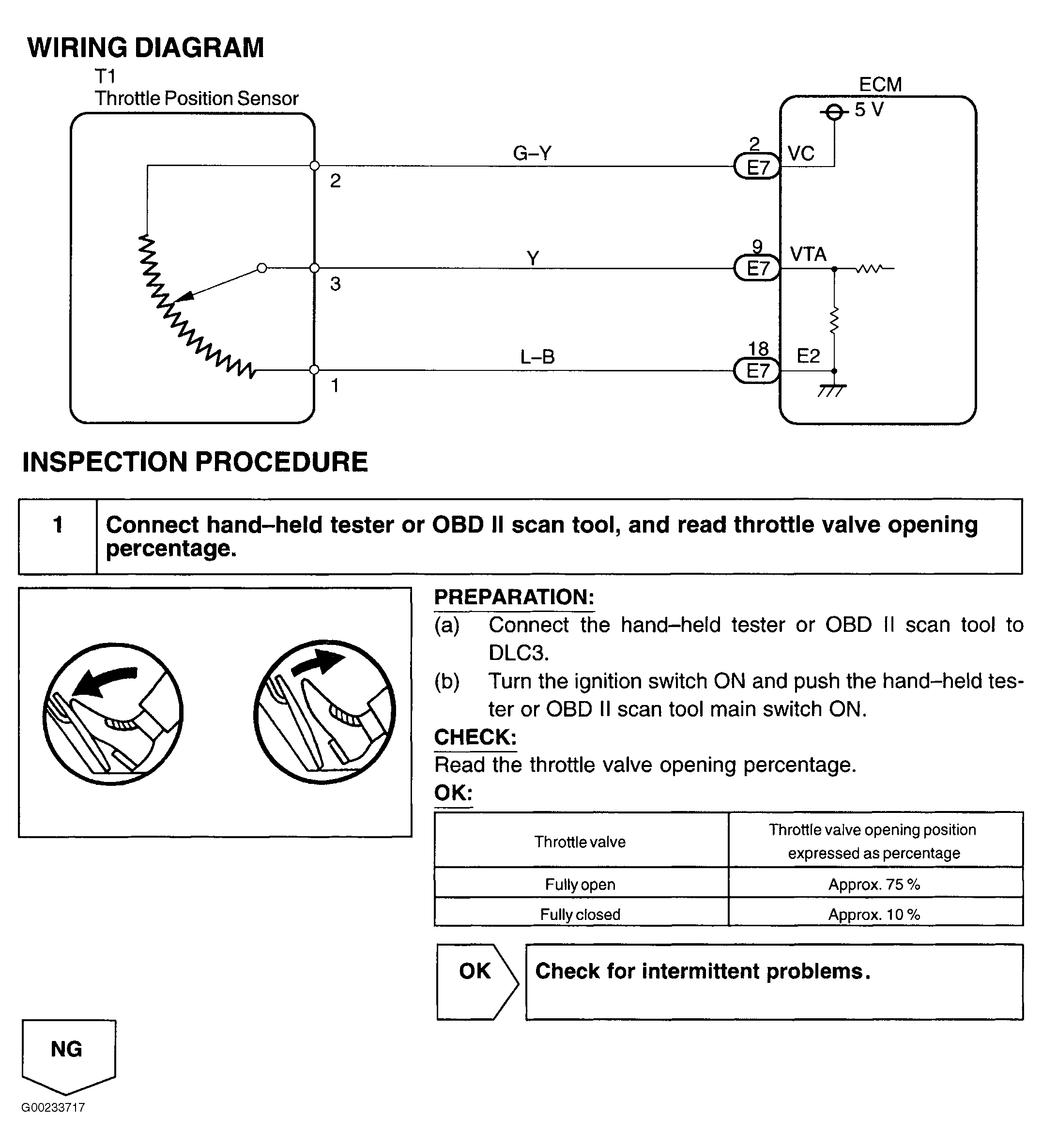 After confirming DTC P0120, use Toyota hand-held tester or scan tool to confirm throttle valve opening percentage with throttle fully closed and fully open to determine probable cause. If percentage displayed is always zero percent, VC circuit may be open or VTA circuit may be open or shorted. If percentage displayed is always approximately 100 percent, E2 circuit may be open. Using hand-held tester or scan tool, read FREEZE FRAME data. Freeze frame data records engine conditions when malfunction is detected.