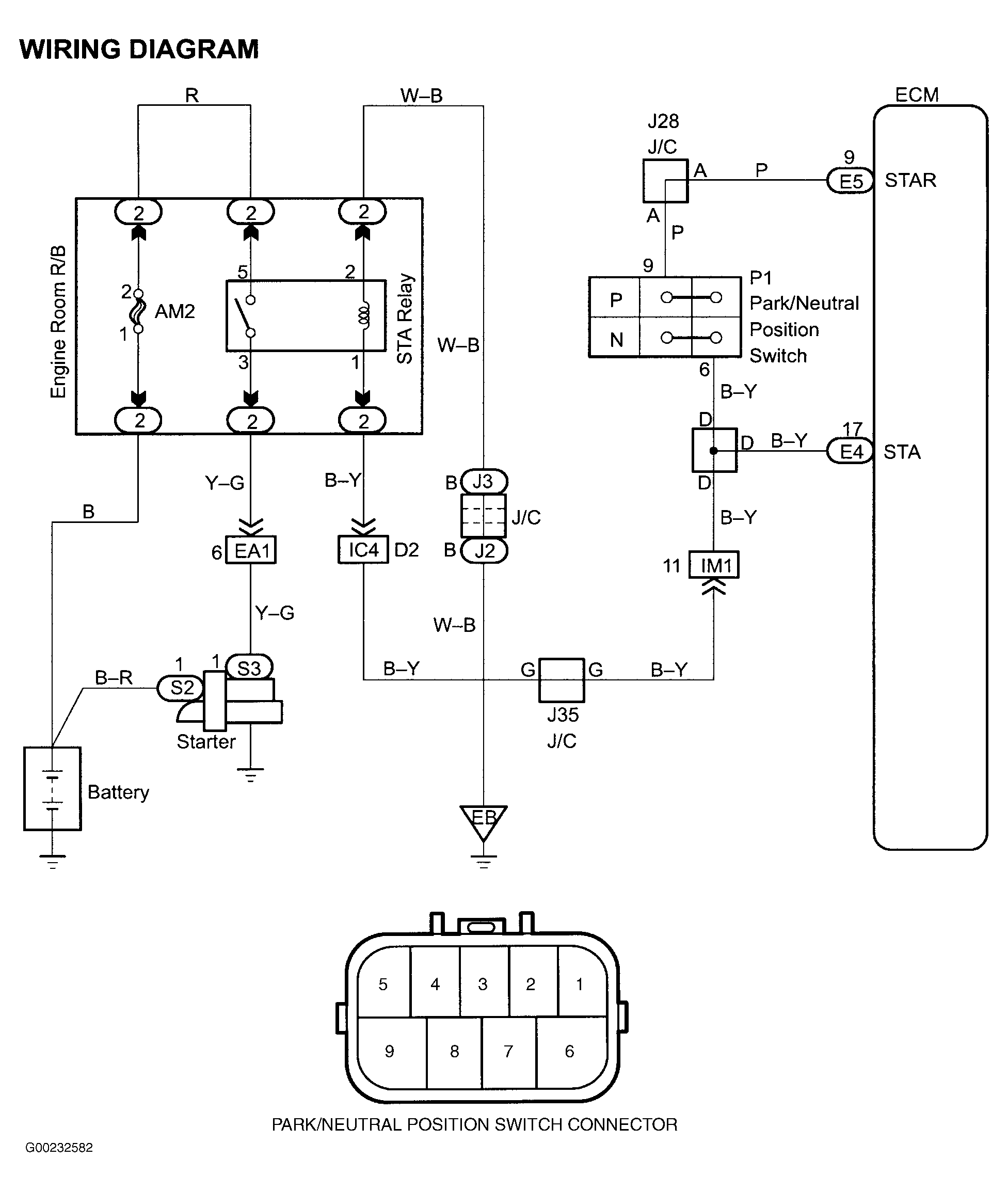 - Remove glove box for access to ECM with electrical connectors still installed on ECM. See Figure. Backprobing, measure voltage between ECM 32-pin connector E6 terminal No. 1 (-) and ECM 34-pin connector E4 terminal No. 17 (+) (Black/Yellow wire) with ignition on and while cranking. See Figure. This is the STA terminal on ECM. The STA voltage should be below 0.5 volts when ignition switch is ON position and 9-14 volts when ignition switch is in START position. If STA voltage is not as specified, go to next step. If STA voltage is as specified, problem is intermittent. Check for defective connections or intermittent problem in wiring harness between park neutral position switch and ECM, and for intermittent problem with park neutral switch.
