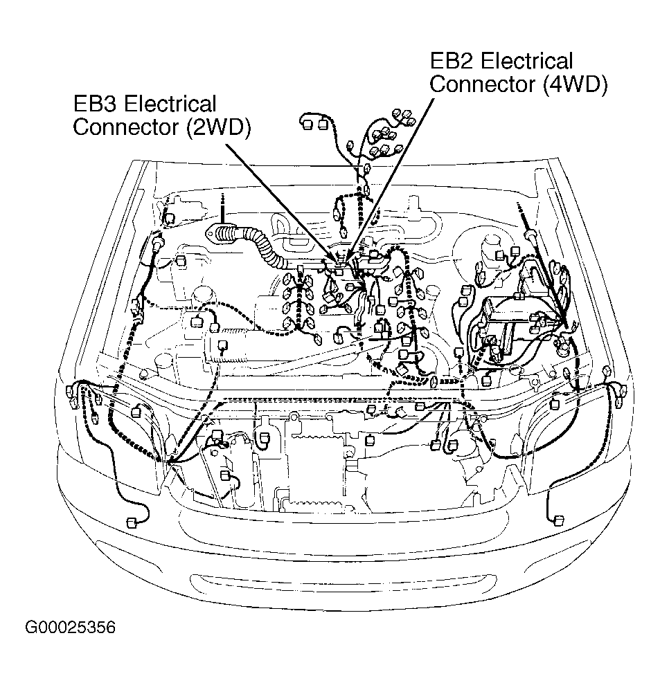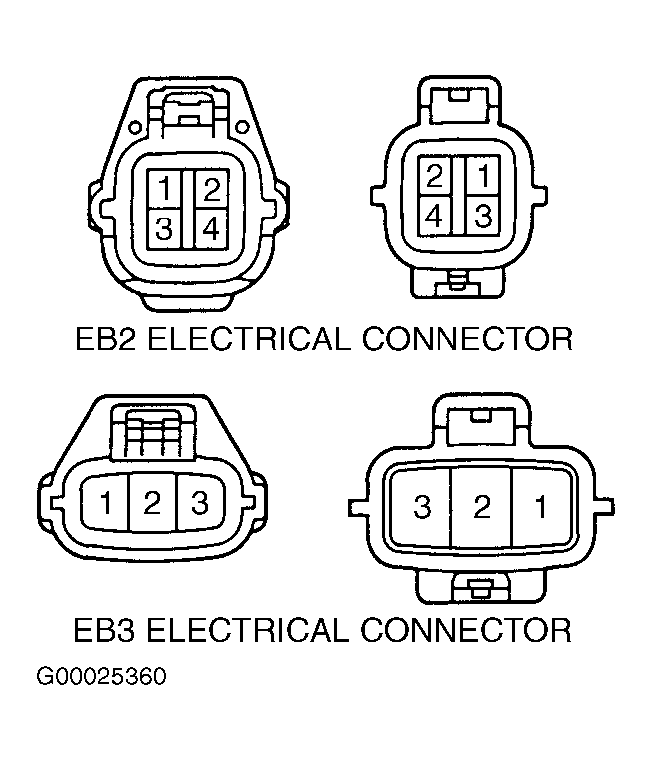 2. Note wire terminal identification in male side of EB2 or EB3 electrical connector. See Figure. On 2WD models, remove wires from terminals No. 2 and 3 in male side of EB3 electrical connector. Reverse wire location for terminals No. 2 and 3 and reinstall wires in male side of EB3 electrical connector. Reconnect EB3 electrical connector. On 4WD models, remove wires from terminals No. 1 and 2 in male side of EB2 electrical connector. Reverse wire location for terminals No. 1 and 2 and reinstall wires in male side of EB2 electrical connector. Reconnect EB2 electrical connector.