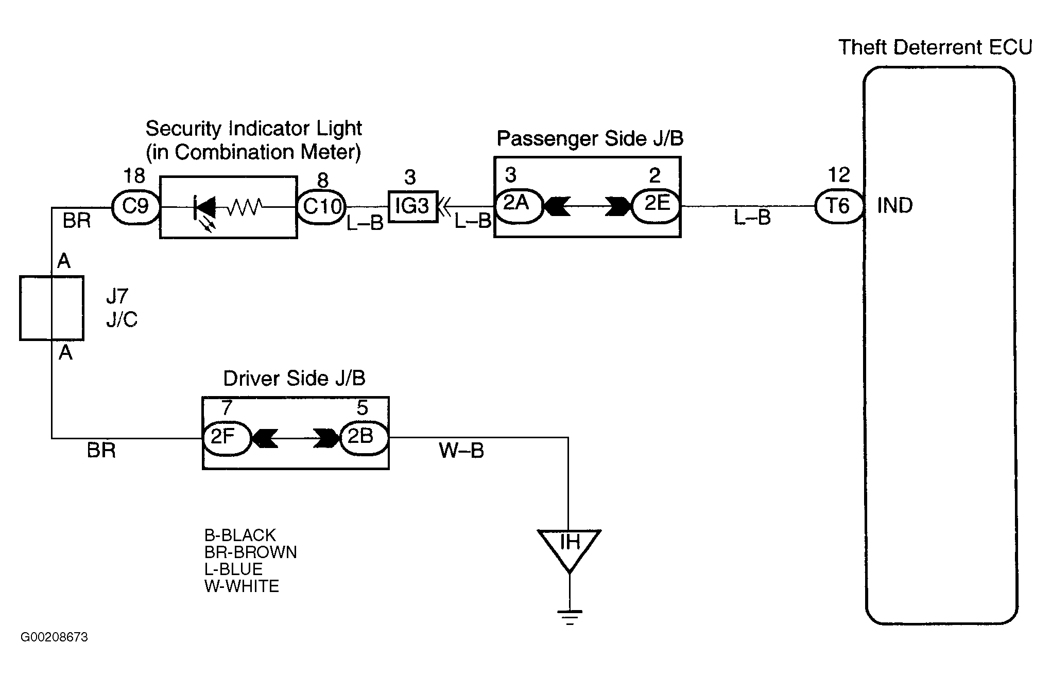 When the anti-theft system is preparing to set, this circuit lights up the indicator light. When the system has been set, it continually turns the indicator light ON for 0.2 second and turns it off for 1.8 seconds, thus blinking the indicator light. See Fig 1.