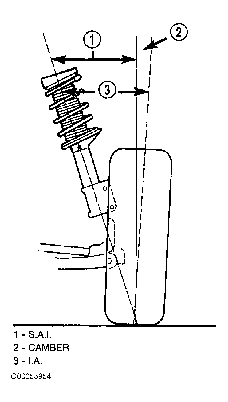 Steering axis inclination is angle between a true vertical line starting at center of tire at road contact point and a line drawn through center of upper ball joint (or strut) and lower ball joint. See Fig 1 . S.A.I. is built into vehicle and is not an adjustable angle. If S.A.I. is not within specifications, a bent or damaged suspension component may be cause.