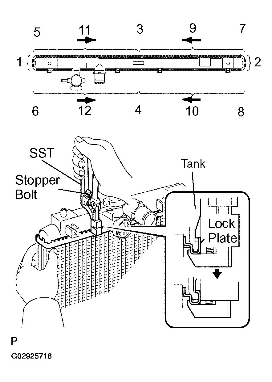 - The points shown in Fig 8 and oil cooler near here (A/T) cannot be tapped with the SST. Use pliers or similar objects and be careful not to damage the core plates.