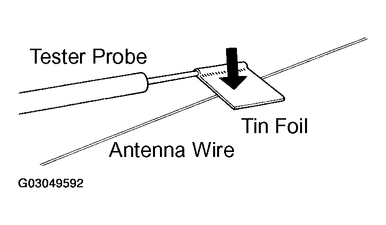 NOTE: When cleaning the glass, wipe it in the direction of the wire with a soft dry cloth. Take care not to damage the wire. Do not use detergents or glass cleaners with abrasive ingredients. When measuring voltage, wind a piece of tin foil around the top of the negative probe and press the foil against the wire with your finger, as shown in Fig 2 .OK: There is continuity in the antenna.