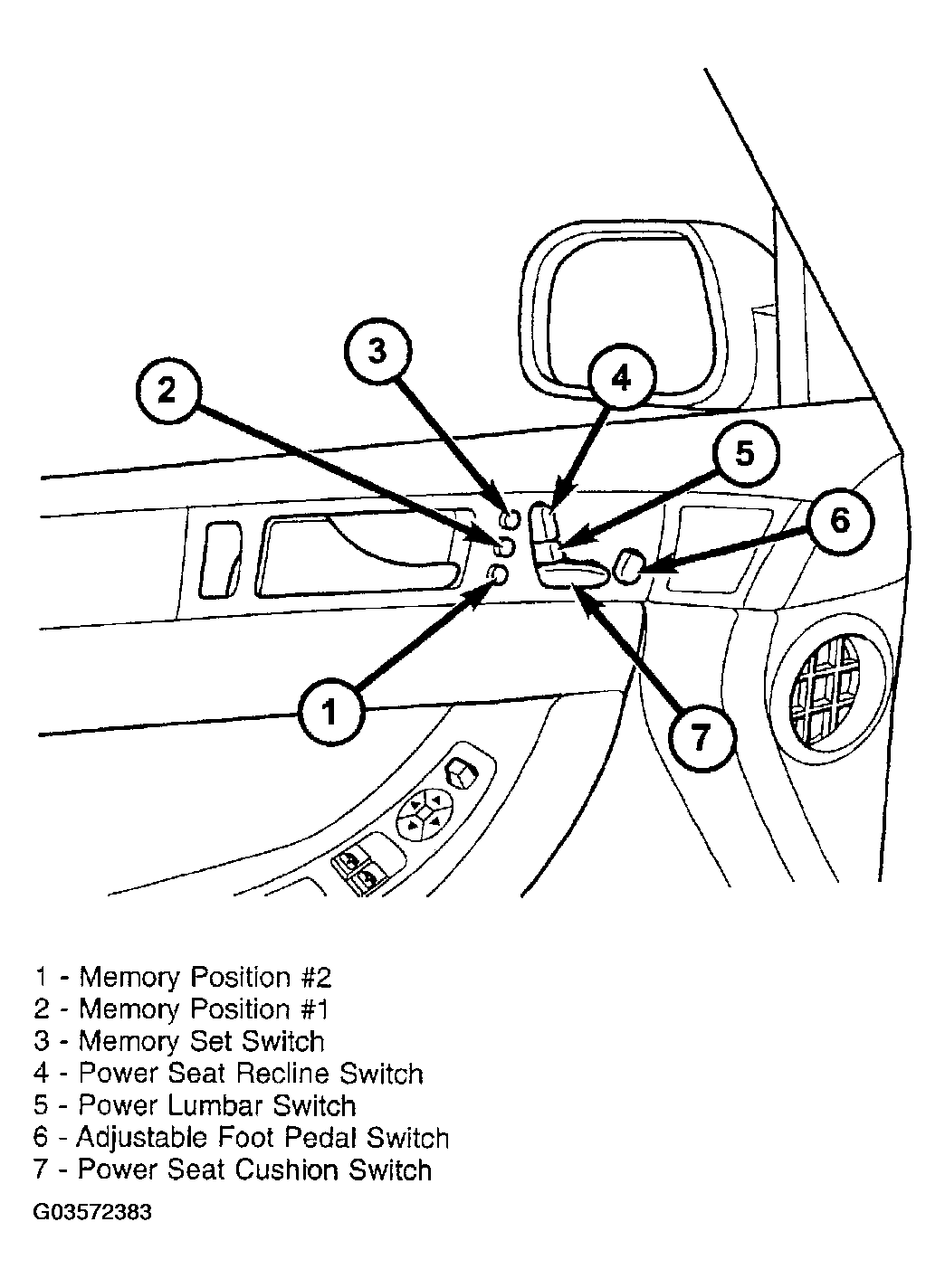 The lumbar control switch is one of eight separate switches ganged together in driver seat switch assembly. The switch is located on the drivers front door trim panel (Fig 1 ). The driver seat switch assembly can provide up to six resistive multiplexed inputs into the driver door module. The inputs can include memory, heated seat, power seat, and foot pedal system requests. All inputs are hardwired resistive mux to the driver door module to decode axis direction or seat heat level. Refer to Driver Door or Memory Heated Seat Adjustable Pedal Modules in ELECTRONIC CONTROL MODULES for additional information.