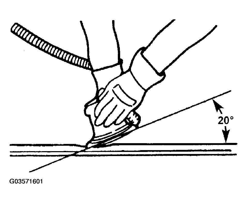 When repairing plastic, the damaged area is first "V'd" out, or beveled. Large bonding areas are desirable when repairing plastic because small repairs are less likely to hold permanently. Beveling the area around a crack at a 20 degree angle will increase the bonding surface for a repair (Fig 3). It is recommended that sharp edges be avoided because the joint may show through after the panel is refinished.