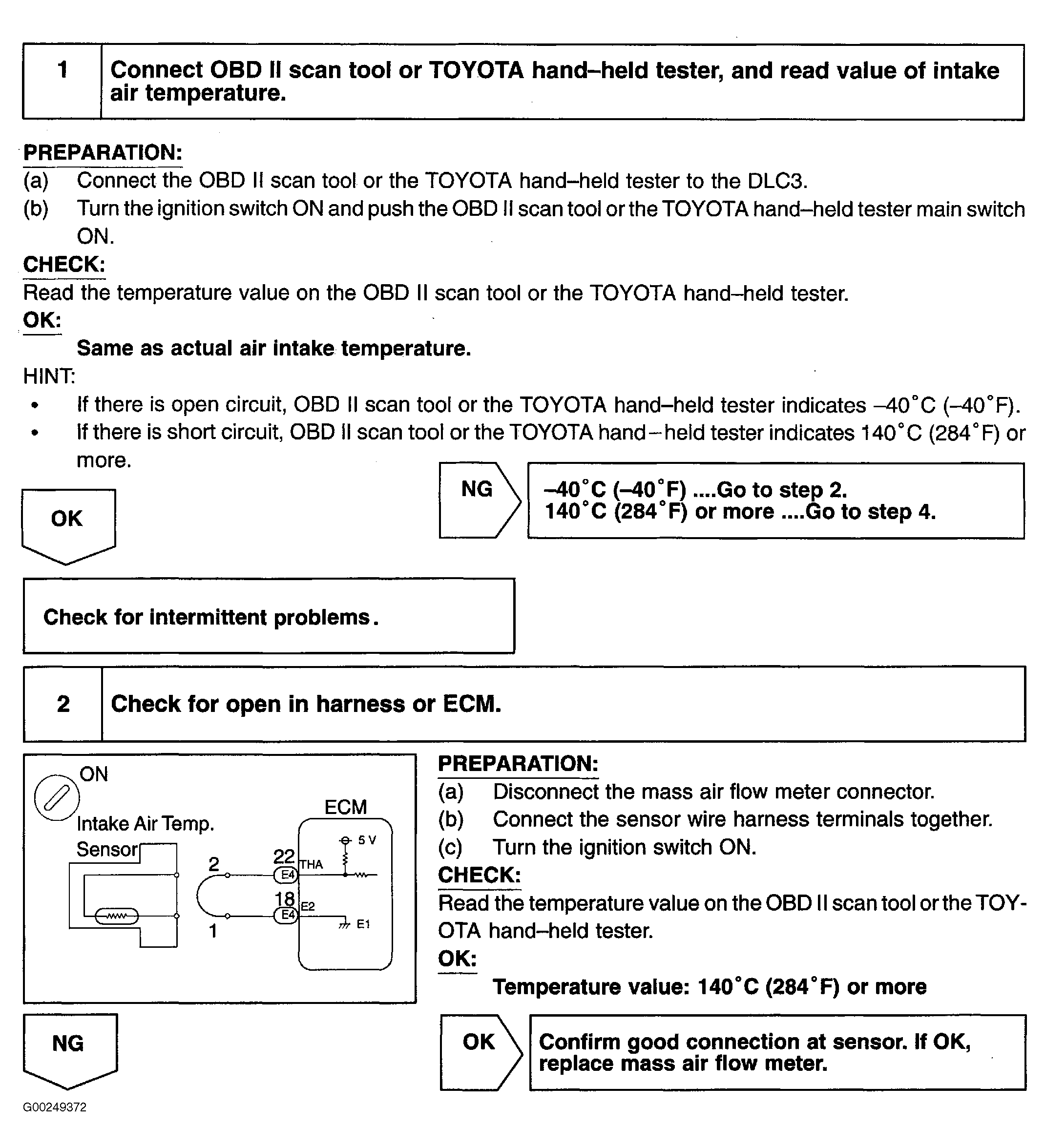 Home >> Toyota >> 2004 >> Matrix XR, FWD, Automatic >> Repair and Diagnosis >> External Pages >> Different car >> Section 130 (Engine Control System Self Diagnostics) >> Diagnostic Tests >> DTC P0110: Intake Air Temperature Sensor Circuit >> Diagnosis & Repair