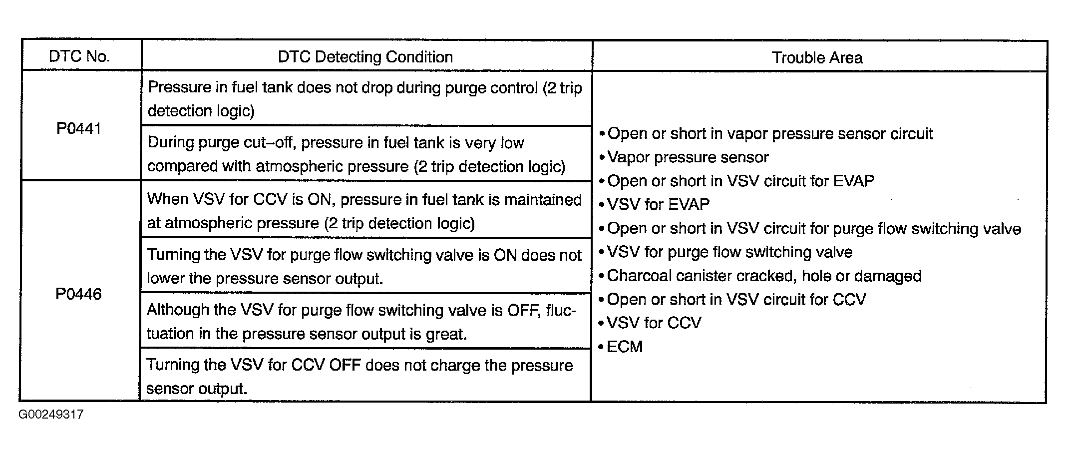 Home >> Toyota >> 2004 >> RAV4 Base, AWD, Automatic >> Repair and Diagnosis >> External Pages >> Different car >> Section 129 (Engine Control System Self Diagnostics) >> Diagnostic Tests >> DTC P0441: EVAP Emission Control System Incorrect EVAP Purge Flow Or P0446: EVAP Emission Control System Vent Control Malfunction >> Possible Causes