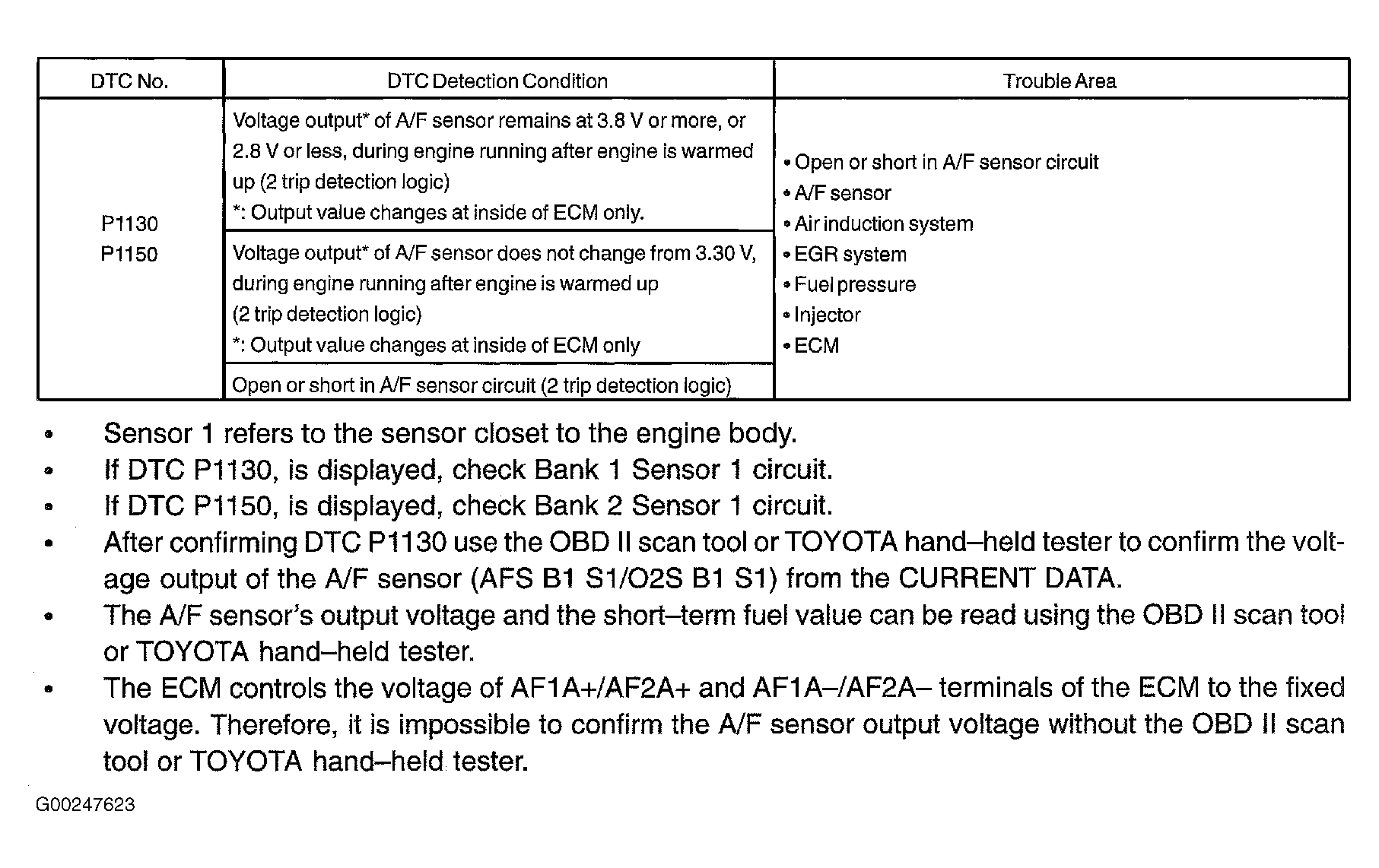 Home >> Toyota >> 2004 >> RAV4 Base, AWD, Automatic >> Repair and Diagnosis >> External Pages >> Different car >> Section 130 (Engine Control System Self Diagnostics) >> Diagnostic Tests >> DTC P1130: A/F Sensor Circuit (Bank 1 Sensor 1) Or DTC P1150: A/F Sensor Circuit (Bank 2 Sensor 1) >> Possible Causes