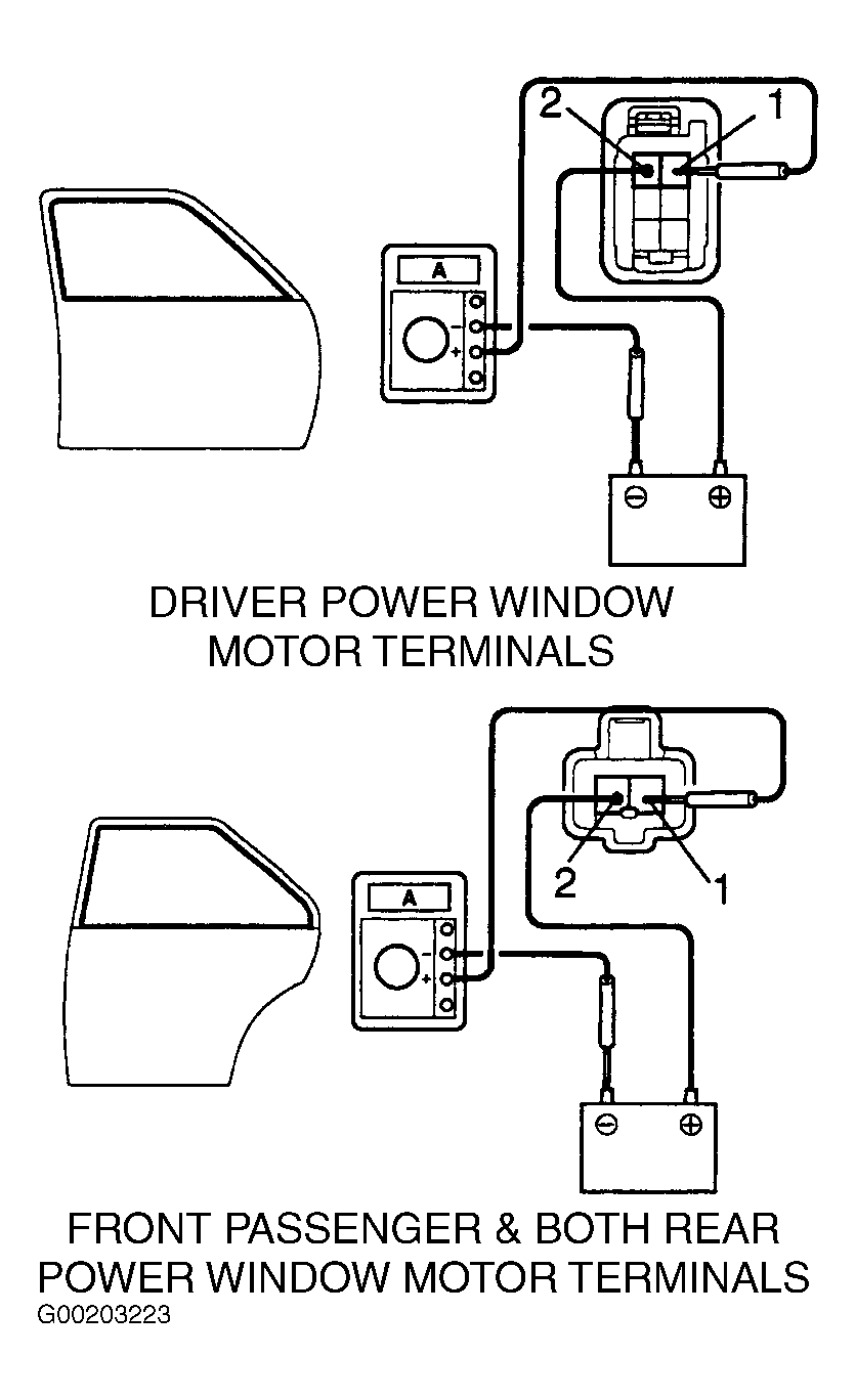 3. After 60 seconds, disconnect ammeter leads and use jumper wires to connect battery positive voltage to power window motor terminal No. 1 and battery negative voltage to terminal No. 2. Power window should begin to lower. Replace power window motor if operation is not as specified.