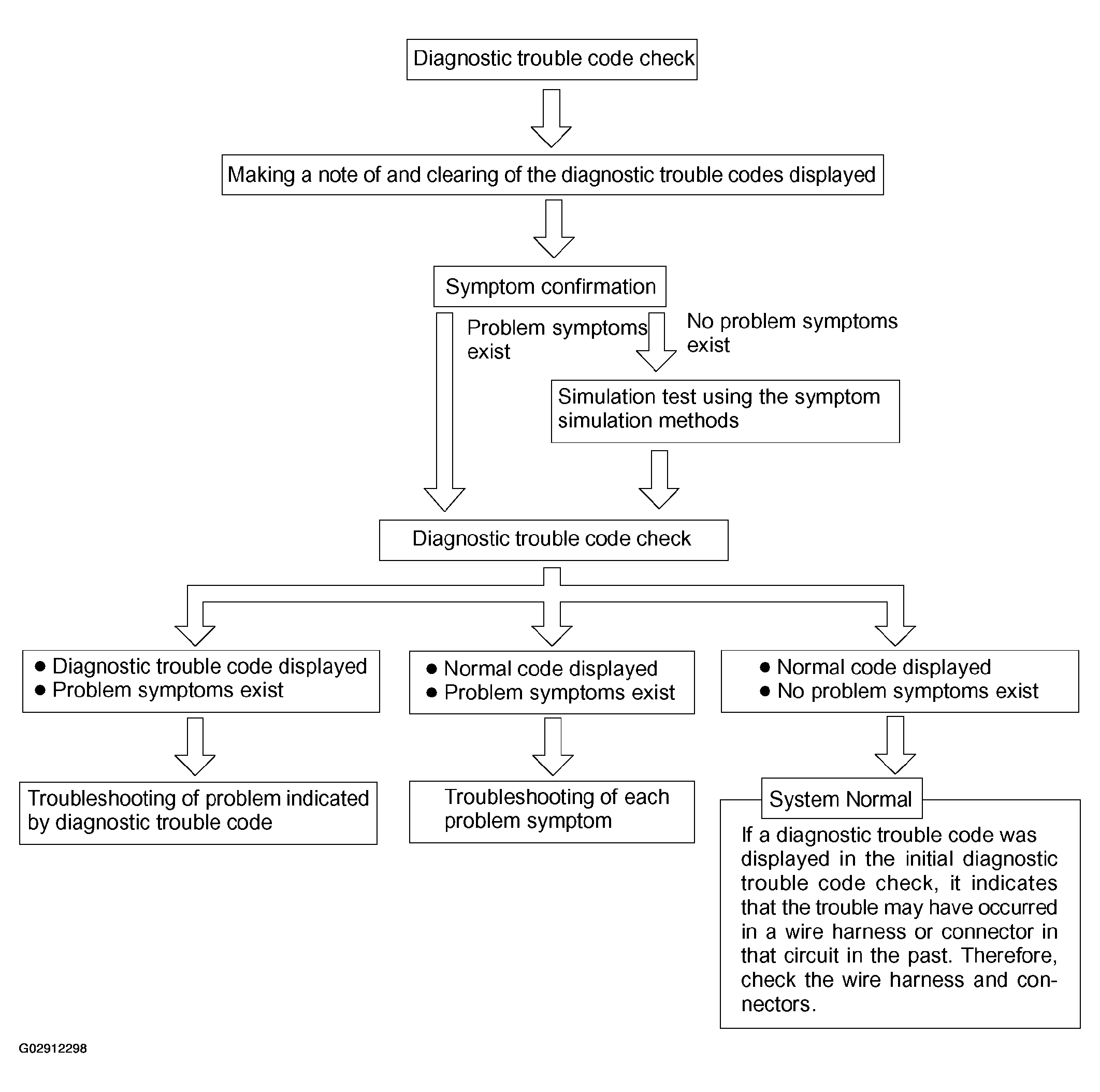 Taking into account the points in Fig 4, a flow chart showing how to proceed with troubleshooting using the diagnostic trouble code check is shown in Fig 5. Directions from the flow chart will indicate how to proceed to DTC troubleshooting or to the troubleshooting of problem symptoms table.