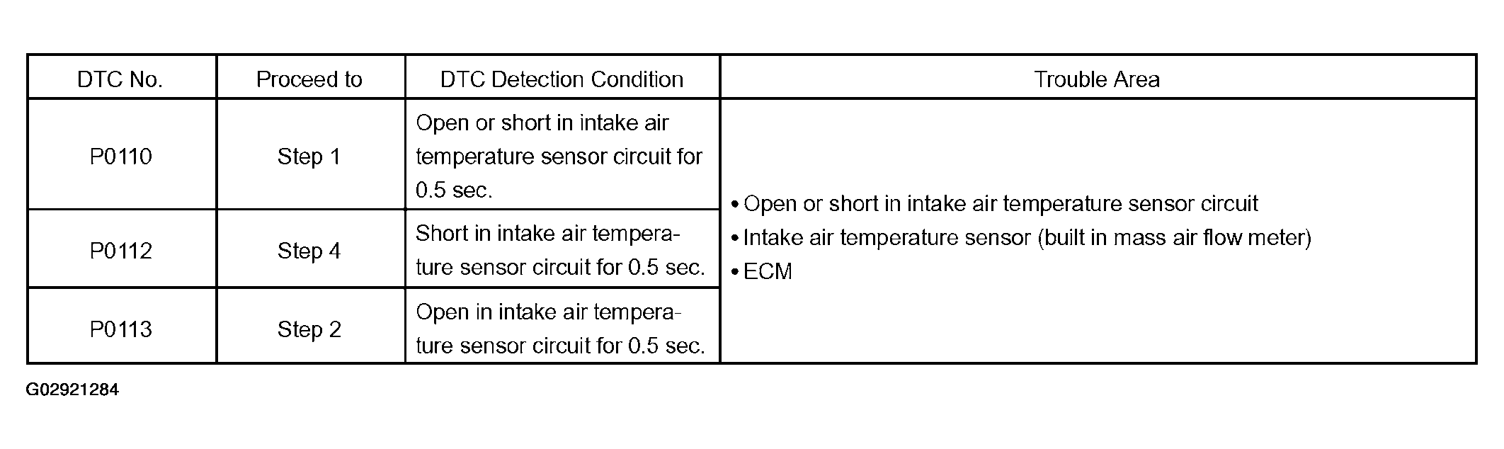 NOTE: After confirming DTC P0110, P0112 or P0113, use the hand-held tester or the OBD II scan tool to confirm the intake air temperature in the DIAGNOSIS / ENHANCED OBD II / DATA LIST / ALL.