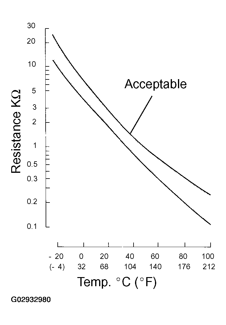 The lower the intake air temperature is the greater the thermistor resistance value becomes and the higher the intake air temperature is the lower the thermistor resistance value becomes (See Fig 1).
