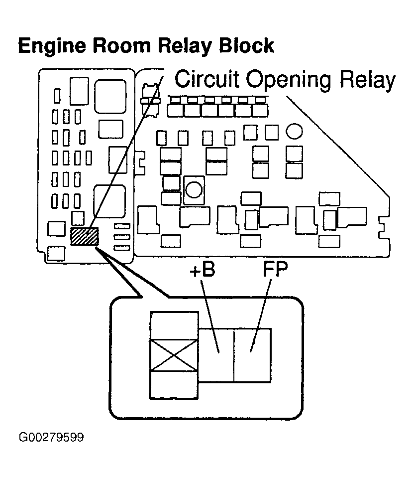 Check fuel pressure with engine off and using Toyota hand-held tester connected to data link connector No. 3 with ignition on to activate fuel pump or remove the circuit opening relay from the engine room relay block and connect a jumper wire to socket terminals +B and FP of the relay block assembly. See Fig 1.