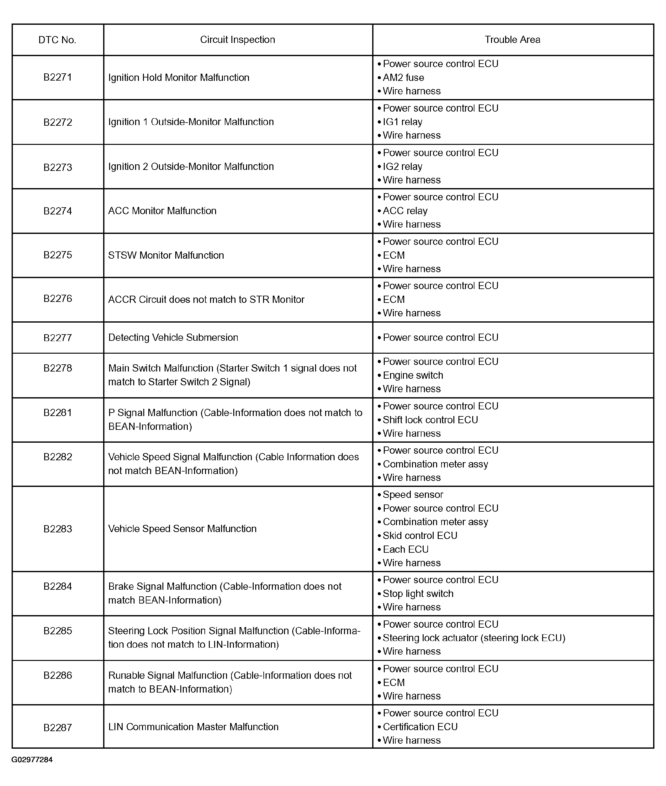 | DTC B2284 | BRAKE SIGNAL MALFUNCTION (CABLE INFORMATION DOES NOT MATCH BEAN INFORMATION) |