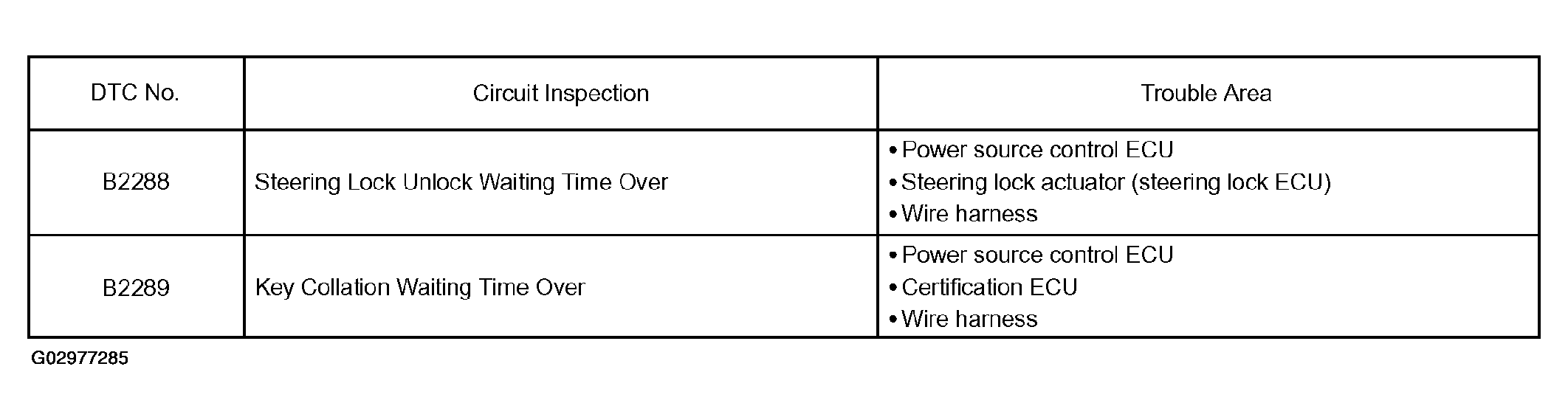 | DTC B2285, B2288 | STEERING LOCK POSITION SIGNAL MALFUNCTION (CABLE-INFORMATION DOES NOT MATCH TO LIN-INFORMATION) & STEERING LOCK UNLOCK WAITING TIME OVER |