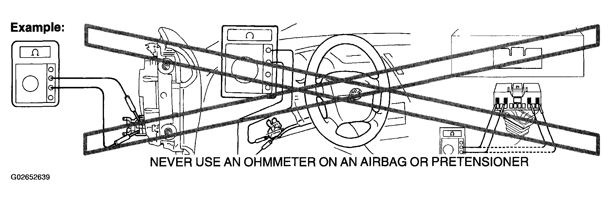 2. Never measure the resistance of the airbag squib. This may cause the airbag to deploy, which is could cause serious injury.