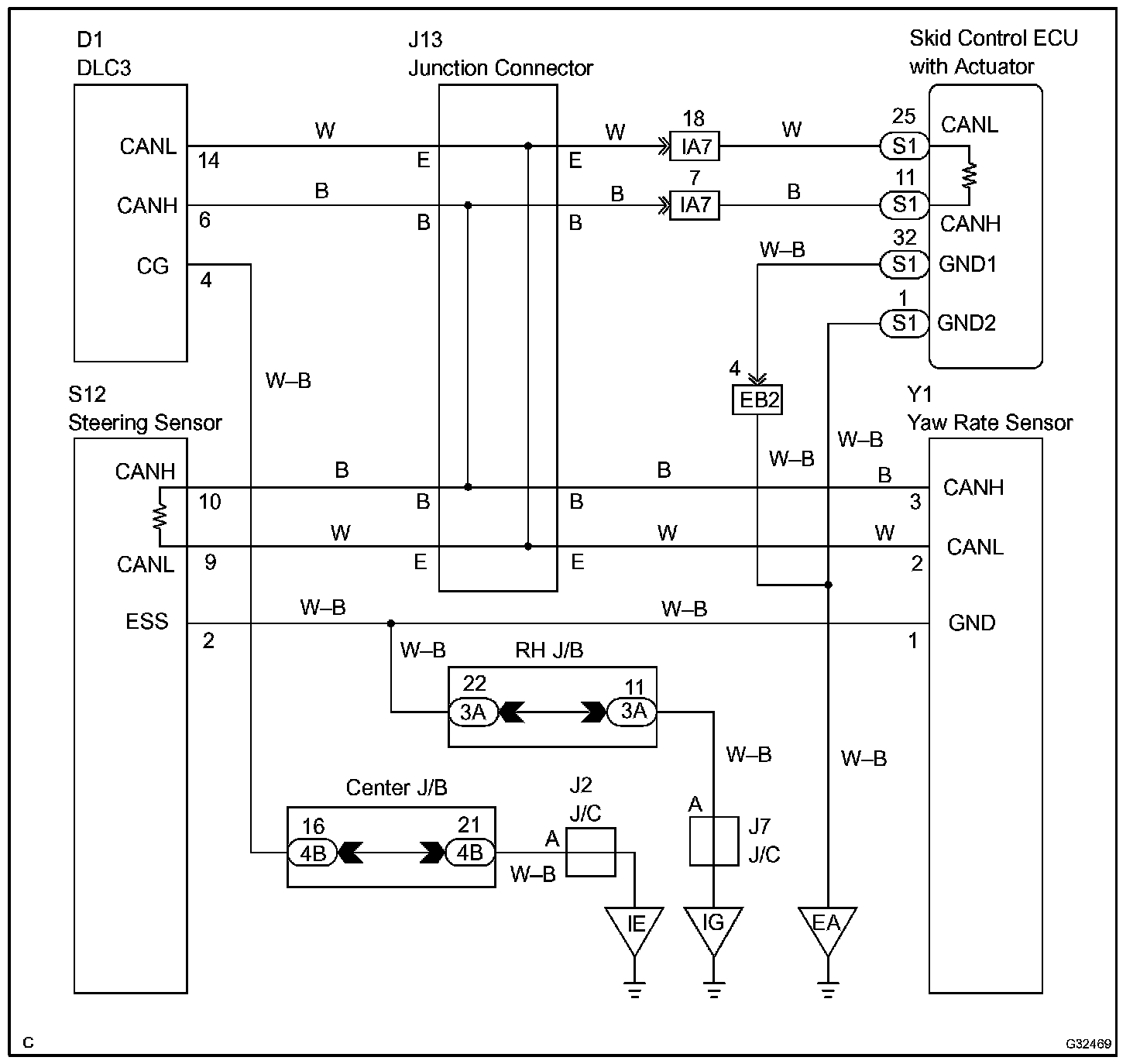 A short to GND is suspected in the CAN bus line when there is continuity between terminals 4 (CG) and 6 (CANH) or terminals 4 (CG) and 14 (CANL) of the DLC3.