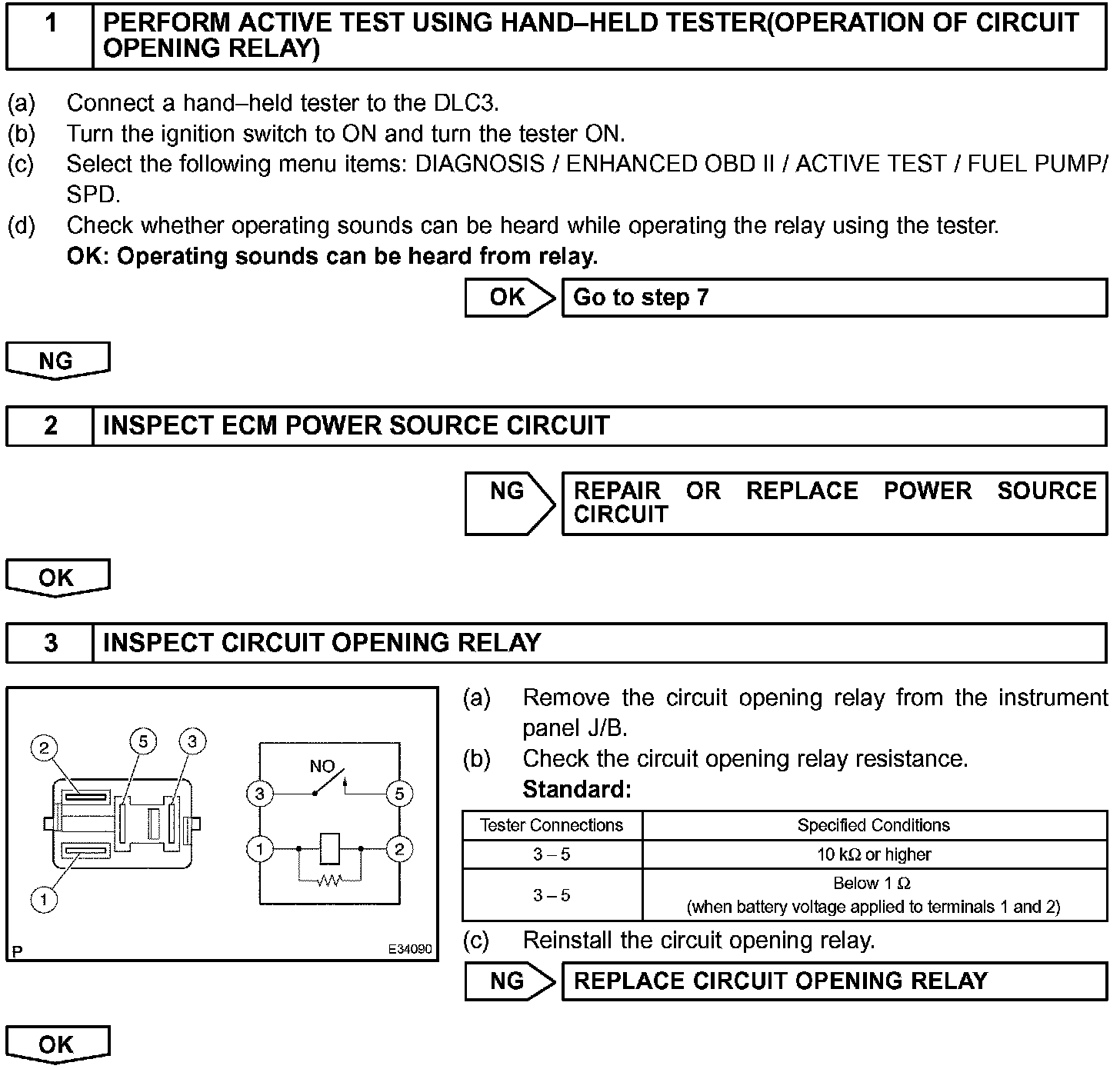 When the STA and NE signals are received by the ECM, Tr (power transistor) is switched on, allowing a current to flow into the circuit opening relay coil. The circuit opening relay switches on, power is supplied to the fuel pump and the fuel pump operates.
