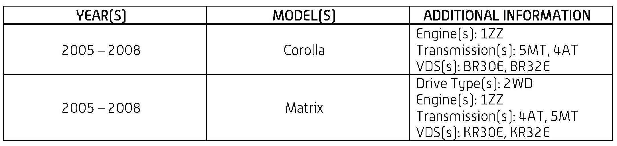 2005 - 2007 model year Corolla/Matrix vehicles are NOT compatible with 2008 model year ECMs.