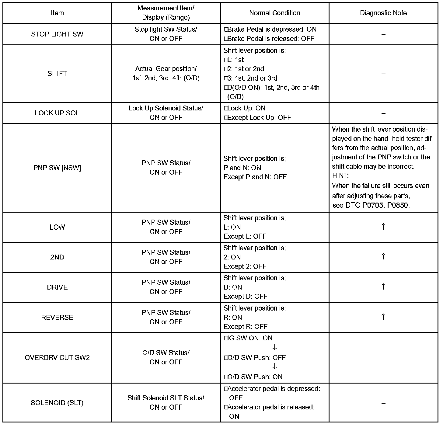 Home >> Toyota >> 2005 >> Matrix 2WD L4-1.8L (1ZZ-FE) >> Repair and Diagnosis >> Powertrain Management >> Transmission Control Systems >> Testing and Inspection >> Scan Tool Testing and Procedures >> Data List