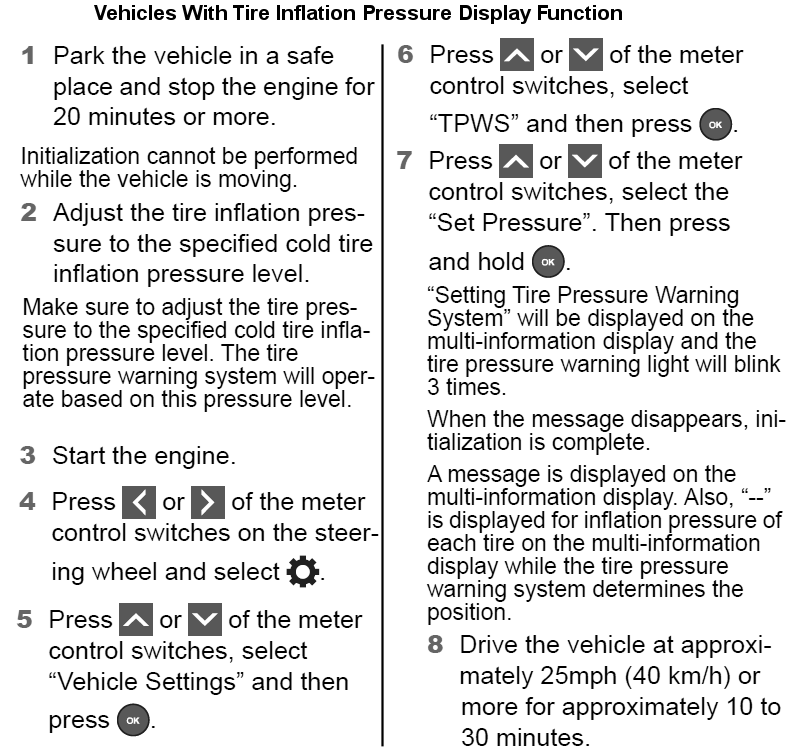 Initializing Vehicles WITH Tire Inflation Pressure Display Function
