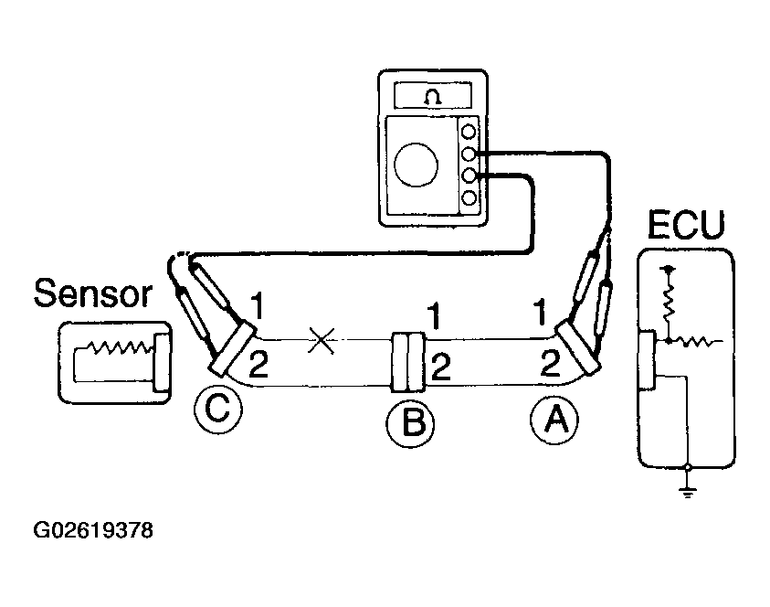 If your results match the examples above, an open circuit exists between terminal 1 of connector A and terminal 1 of connector C.