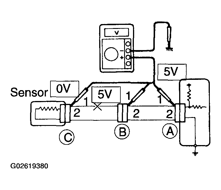 TESTER CONNECTION SPECIFIED CONDITION CHARTTester Connection Specified Condition Connector A terminal 1 - Body ground 5 V Connector B terminal 1 - Body ground 5 V Connector C terminal 1 - Body ground 0 V If your results match the examples above, an open circuit exists in the wire harness between terminal 1 of connector B and terminal 1 of connector C.