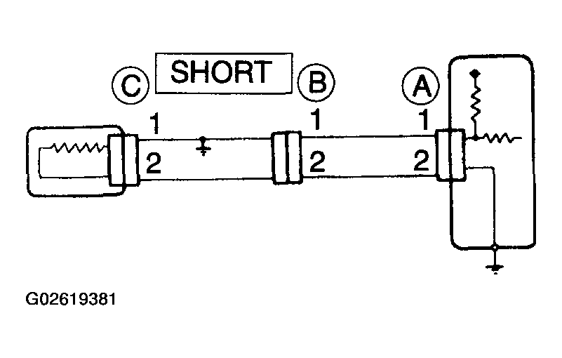 If your results match the examples above, a short circuit exists between terminal 1 of connector A and terminal 1 of connector C.