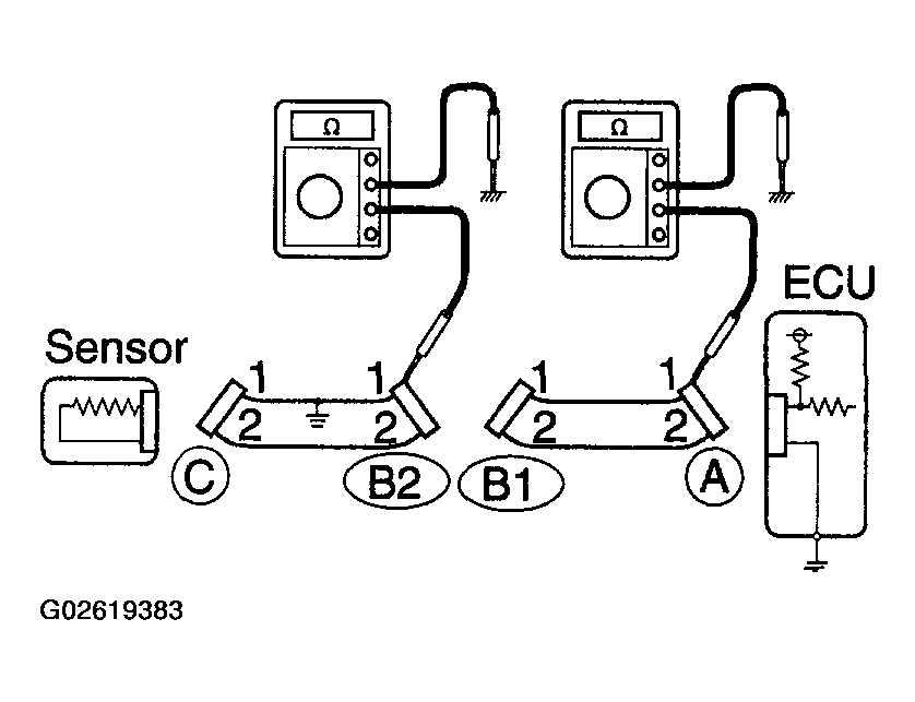 TESTER CONNECTION SPECIFIED CONDITION CHARTTester Connection Specified Condition Connector A terminal 1 - Connector B1 terminal 1 Below 1 Ω Connector B2 terminal 1 - Connector C terminal 1 10 kΩ or higher If your results match the examples above, an open circuit exists between terminal 1 of connector B2 and terminal 1 of connector C.