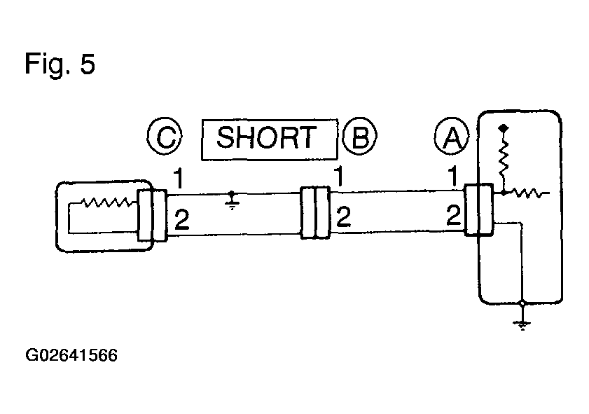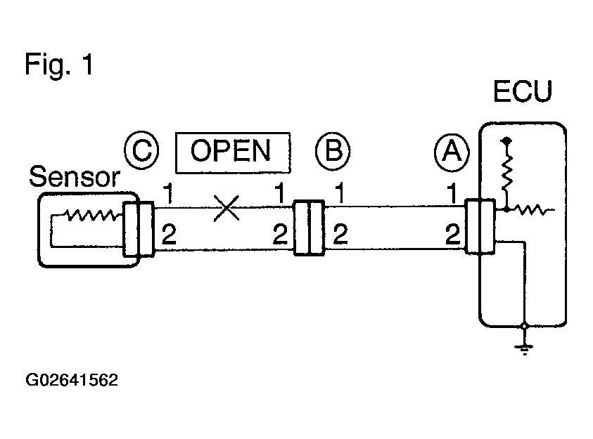 In the above example, an open circuit is in the wire harness between terminal 1 of B and terminal 1 of C.