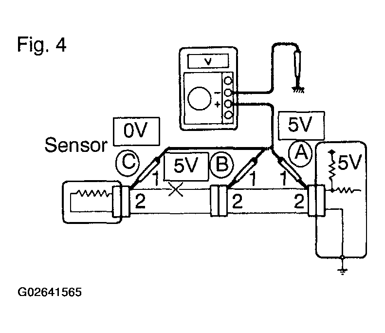 As shown in Fig 12, with each connector still connected, measure the voltage between body ground and terminal 1 of connector A at the ECU 5V output terminal, terminal 1 of connector B, and terminal 1 of connector C (in that order).