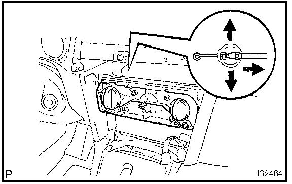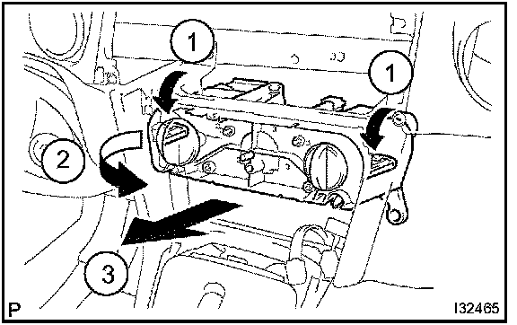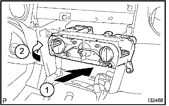 b. Release the 2 fitting claws and pull out the air conditioning control assembly, as shown in the illustration.
