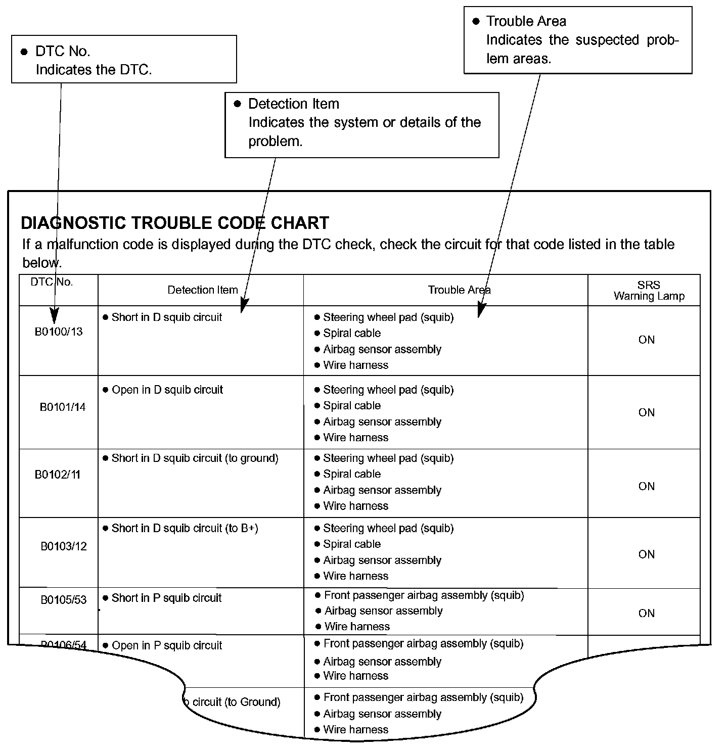 Use Diagnostic Trouble Codes (DTCs) (from the DTC checks) in the table to determine the trouble area and proper inspection procedure. The Supplemental Restraint System (SRS) DTC chart is shown as an example.
