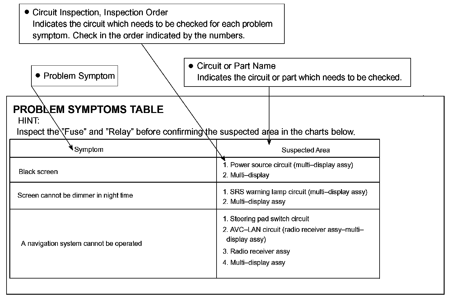 The suspected circuits or parts for each problem symptom are shown in the table. Use this table to troubleshoot when, during a DTC check, a "Normal" code is displayed but the problem is still occurring. Numbers in the table show the inspection order in which the circuits or parts should be checked.
