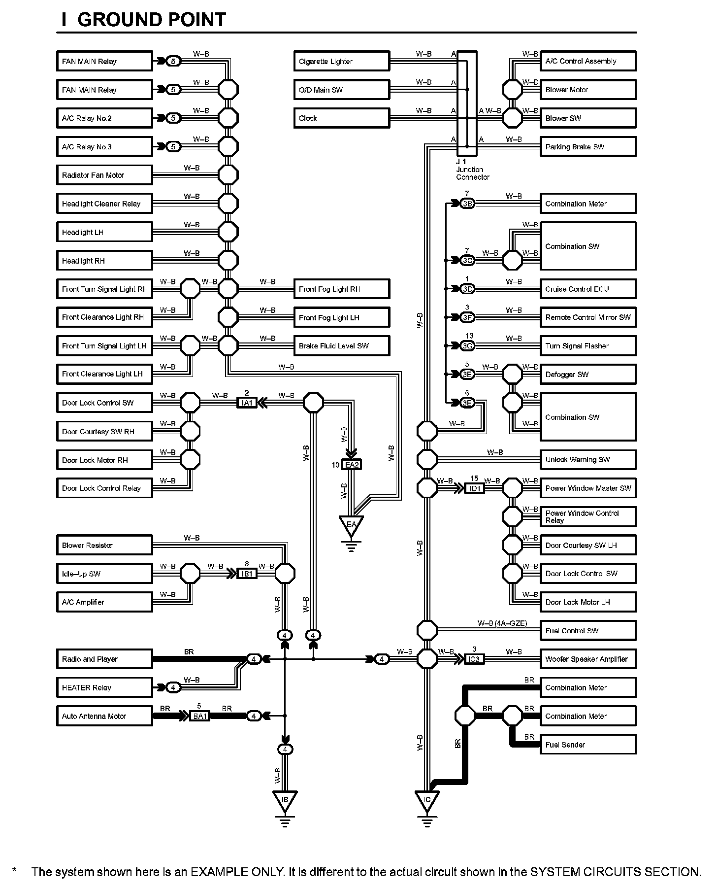 The ground points circuit diagram shows the connections from all major parts to the respective ground points. When troubleshooting a faulty ground point, checking the system circuits which use a common ground may help you identify the problem ground quickly. The relationship between ground points ([EA], [IB], and [IC] shown) can also be checked this way.
