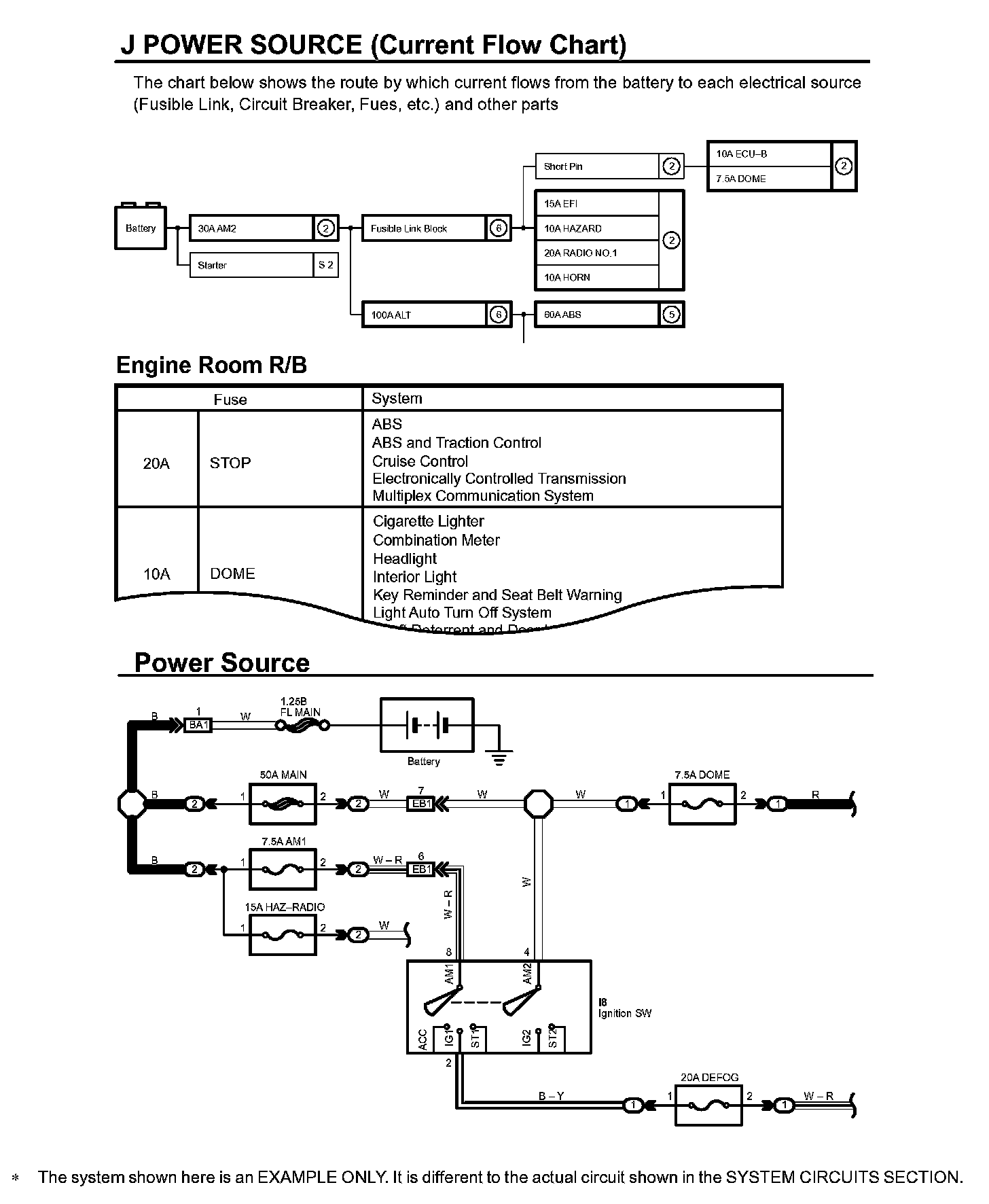 The Current Flow Chart section, describes which parts each power source (fuses, fusible links, and circuit breakers) transmits current to. In the Power Source circuit diagram, the conditions when battery power is supplied to each system are explained. Since all System Circuit diagrams start from the power source, the power source system must be fully understood.
