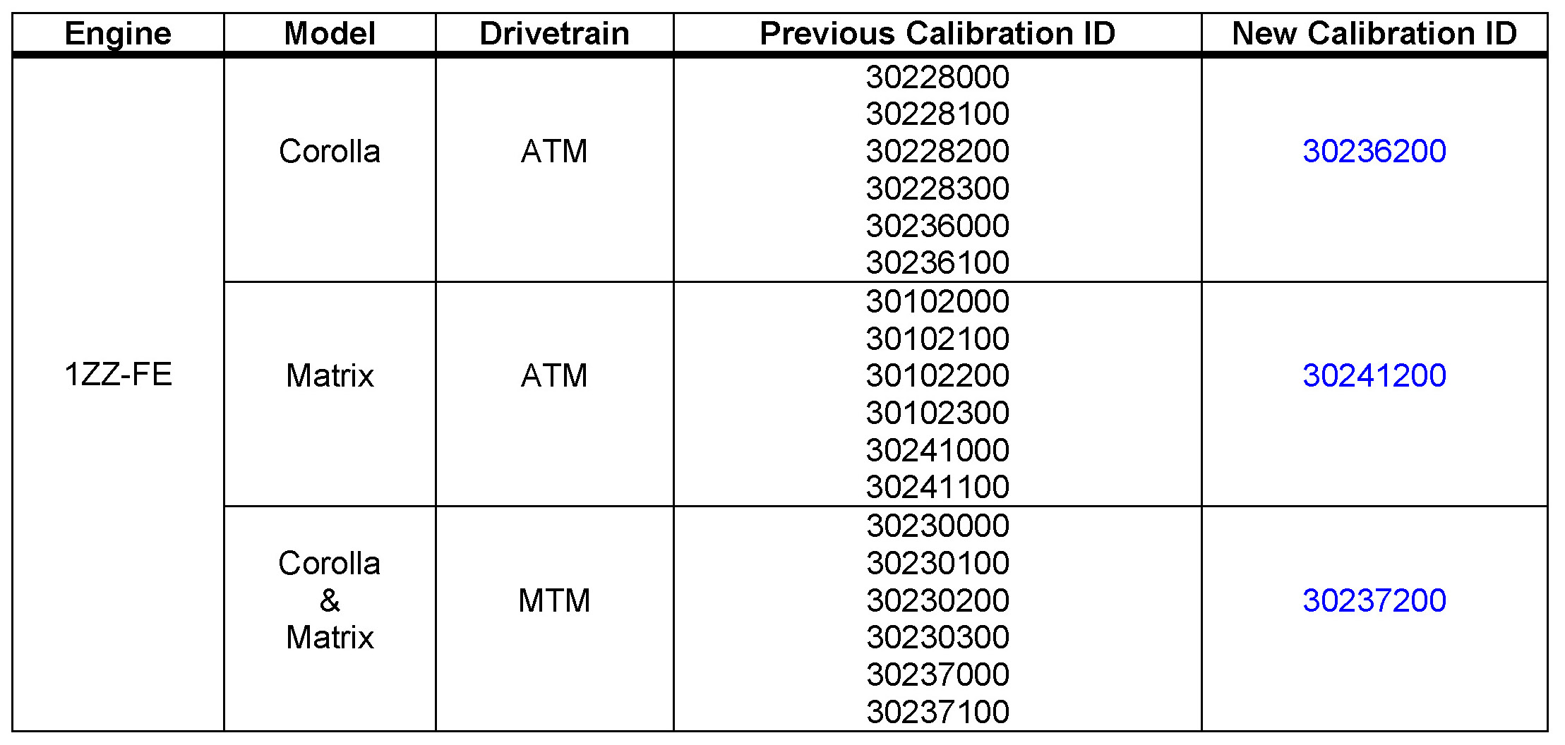 - 2005 - 2006 model year Corolla and Matrix (2WD) vehicles equipped with the 1ZZ-FE engine.