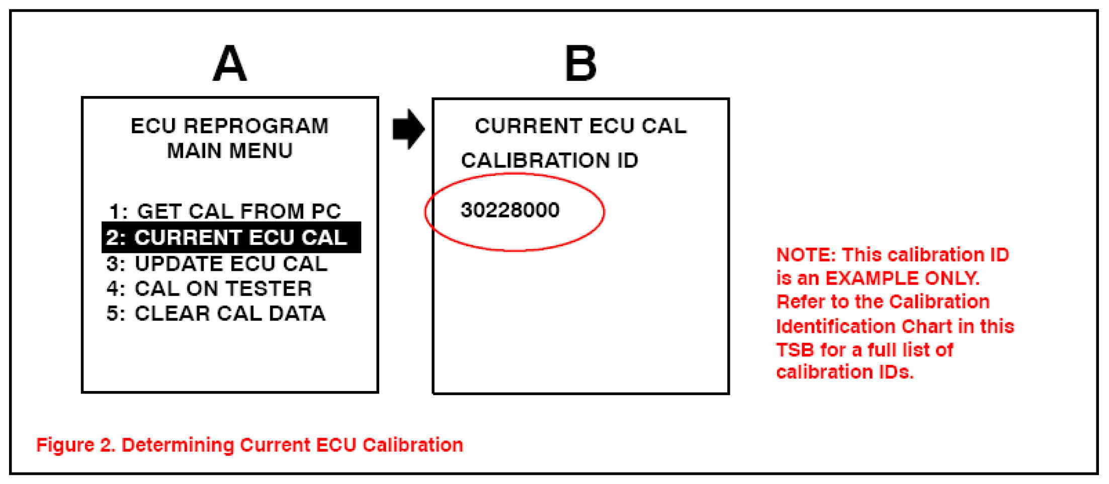 2. Connect the Diagnostic Tester to the vehicle and select CURRENT ECU CAL from the ECU REPROGRAM MAIN MENU. Determine the vehicle's current ECU calibration (see Figure 2).