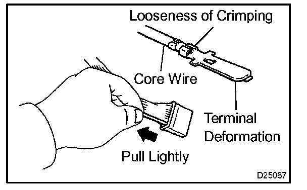 2. Checking when a connector is disconnected: Check by pulling the wire harness lightly from the backside of the connector. Look for unlatched terminals, missing terminals, loose crimps or broken conductor wires.
