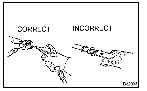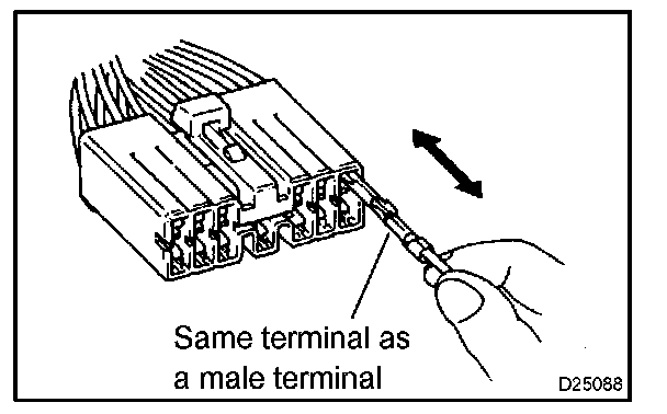 3. Checking the contact pressure of the terminal: Prepare a spare male terminal. Insert it into a female terminal, and check for good tension when inserting and after full engagement.