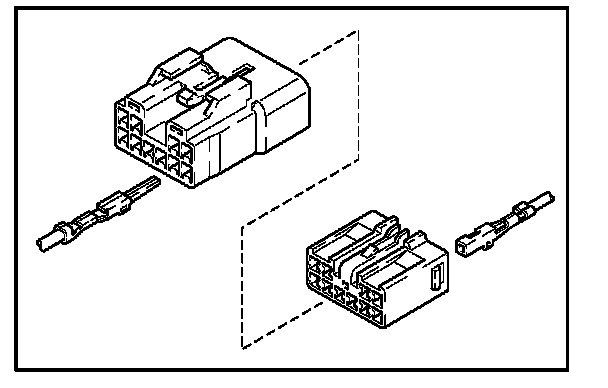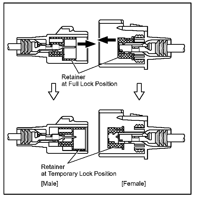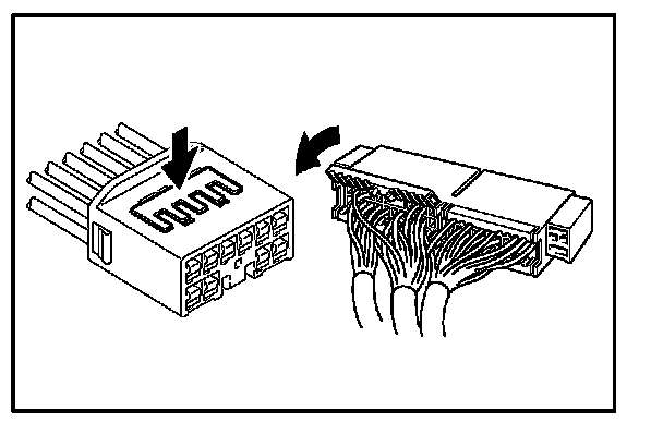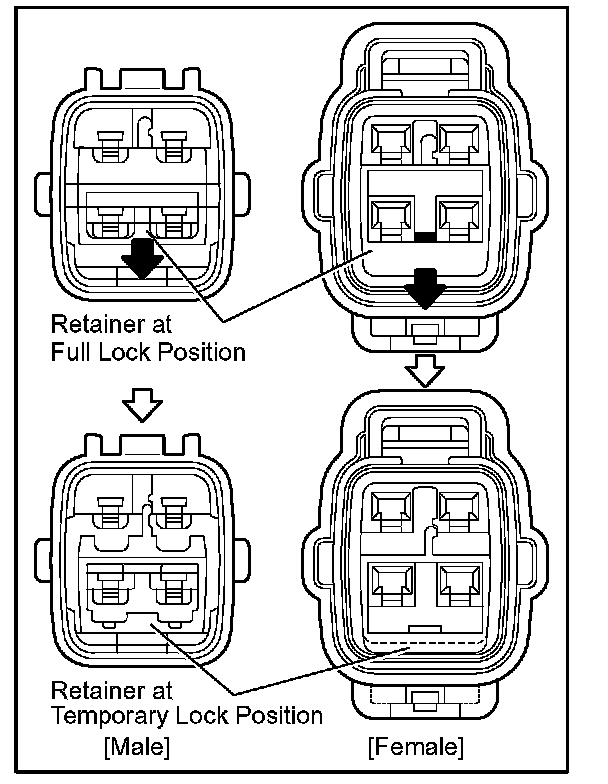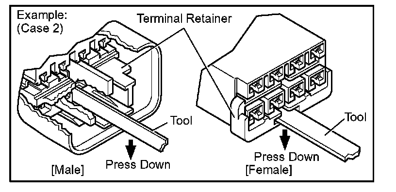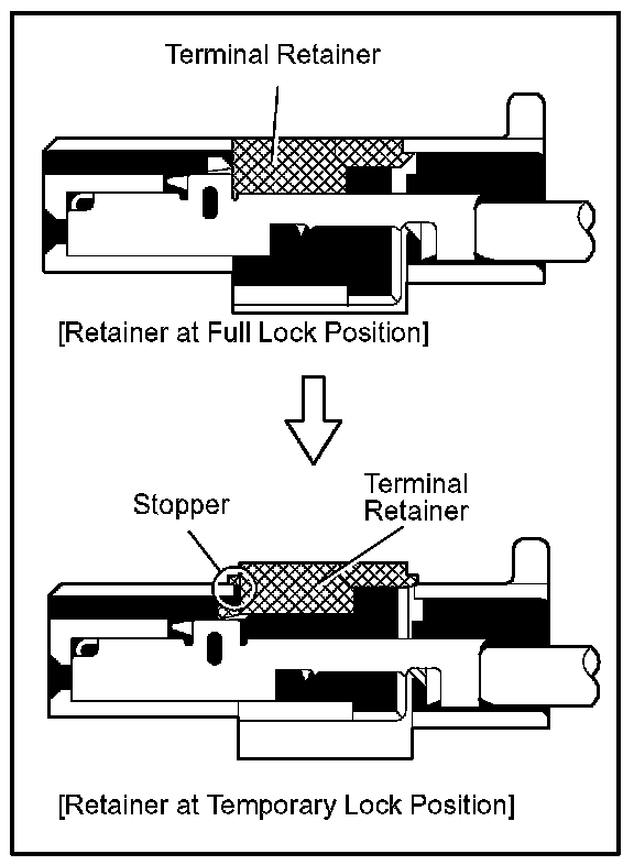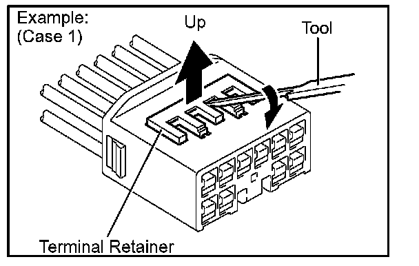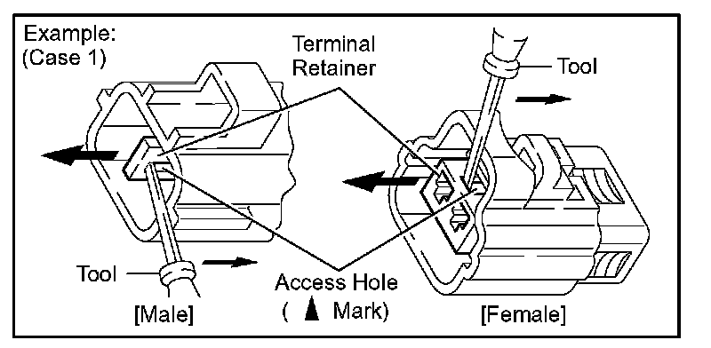 Insert the special tool into the terminal retainer access hole (/\ Mark) and pull the terminal retainer up to the temporary lock position.
