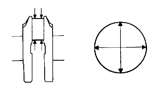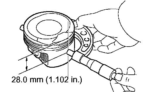 Using a micrometer, measure the piston diameter at right angles to the piston pin hole, and at a piston of 28.0 mm (1.102 inch) from the top the piston head.